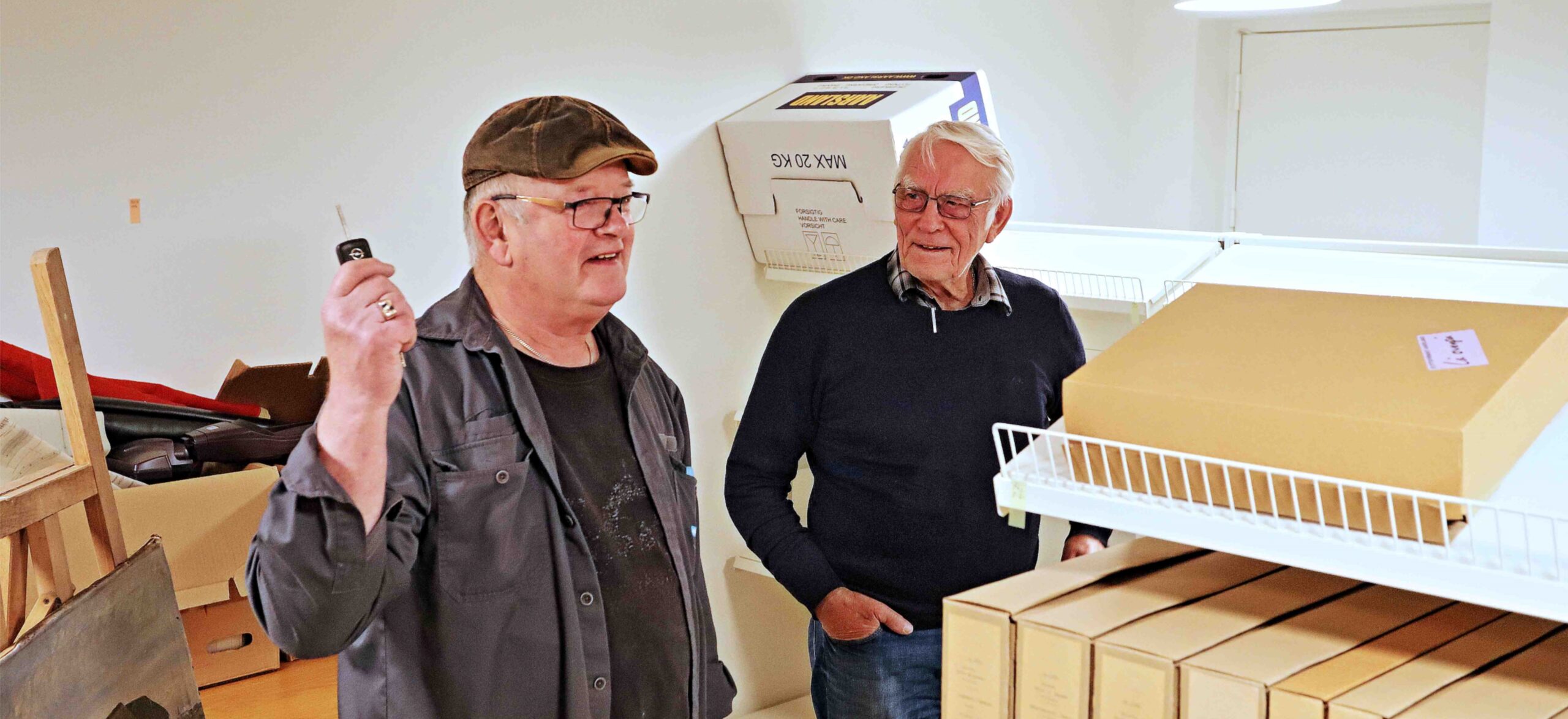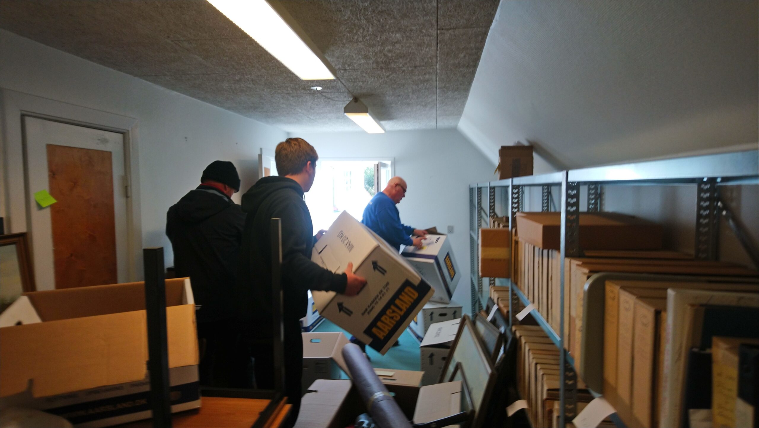 Det nye lokale i Åhuset har en konstant temperatur – og er uden vinduer: – Det er optimale vilkår for de mange bøger, hæfter, protokoller og billeder, påpeger Stig Hegn, som havde søgt hjælp hos flyttefirmaet Aarsland til transporten fra Forsamlingshuset til Åhuset.