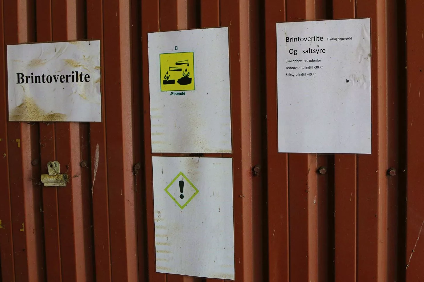 Ved siden af hænger der en instruktion for opbevaring og bortskaffelse af kemisk affald.