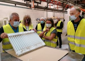 Under rundvisningen var medarbejdere i gang med at klargøre en 63 tons tunge presser til at blive flyttet. En stor udfordring viste det sig – da pressen for 20 år siden ankom til støberiet blev den løftet ned gennem taget af en kæmpestor kranbil. Dengang kunne kranbilen køre ned ad Sct. Peders Gade og hejse pressen ind over bygningen. I dag 20 år senere, er et af træerne på hjørnet af Sct. Peders Gade imidlertid vokset sig så stor, at kranbilen ikke kan køre ned ad gaden. Sådan et træ får man ikke lige lov til at fælde. Så medarbejderne har været kreative og planen er nu, at pressen inde i hallen løftes op af gulvet, lægges på siden, køres igennem fabrikken om til en port, som godt nok er 3 cm for smal! Den gøres derfor en anelse bredere og pressen kan komme udenfor og en mindre kranbil kan løfte og transportere den videre på sin rejse.