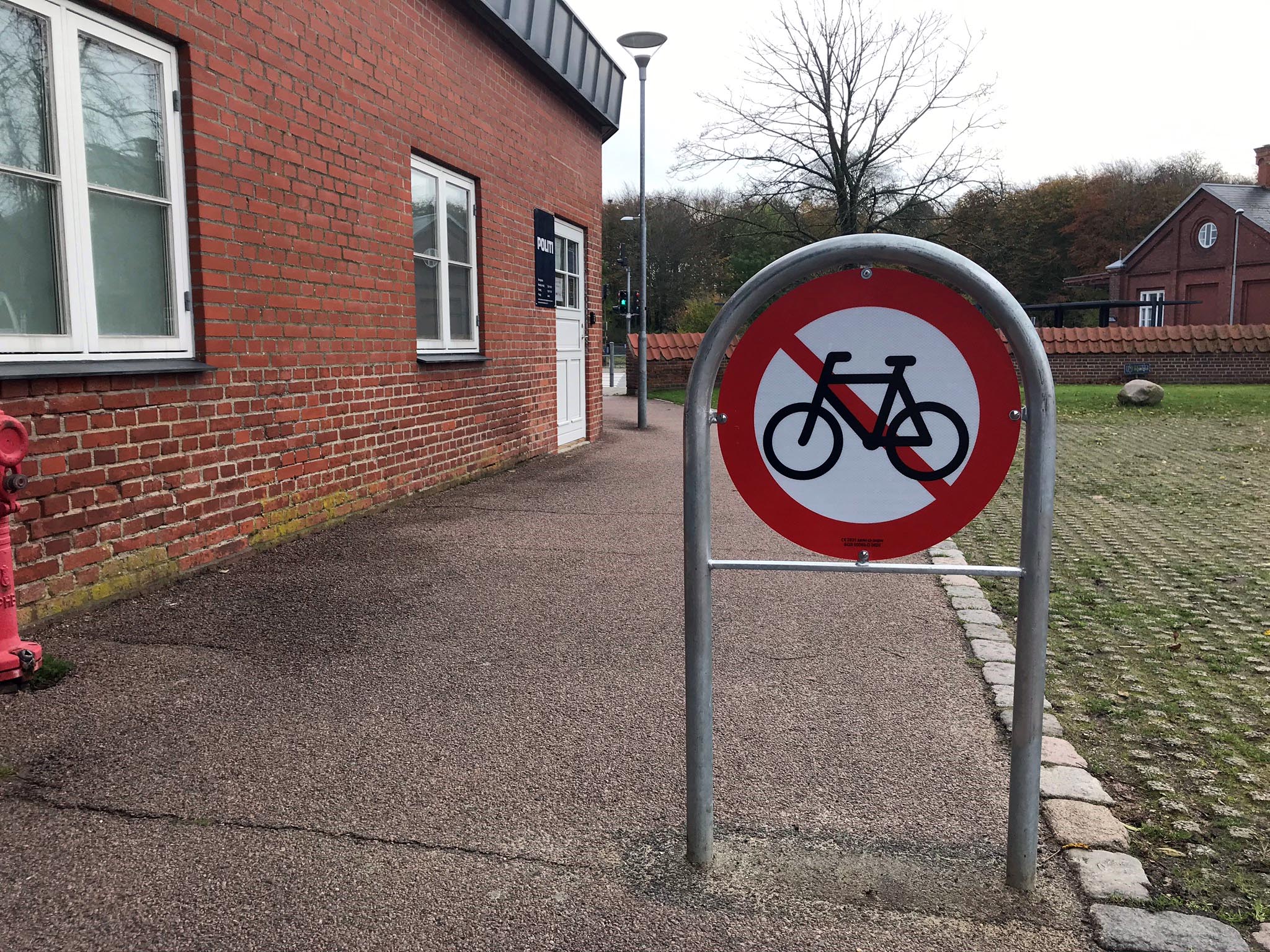 I den travle morgentrafik omkring Banegården, har mange ilet til toget af den lille passage ved Brand- og Politistationen. Ind i mellem blev de travle fodgængerne også blandet med lige så travle cyklister. Det er slut nu, i hvert fald på lovlig vis, for nu er der kommet et skilt op om cykling forbudt. Nu må turen gå over Odins plads til cykelstien.