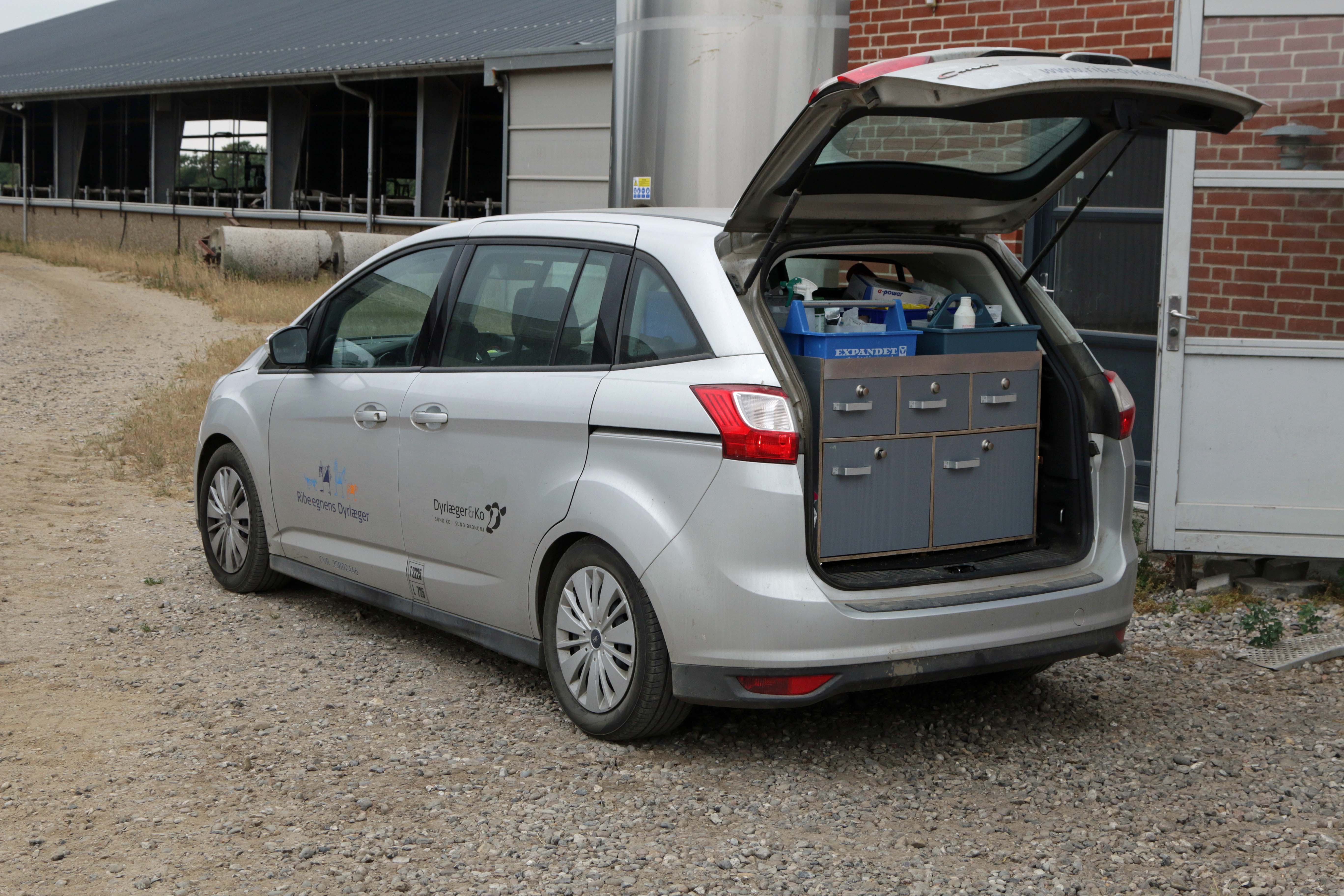 Dyrlægen kunne herefter gå tilbage til sin bil, som har en unik indretning og bestykning – både medikamenter, handsker og de obligatoriske gummistøvler.