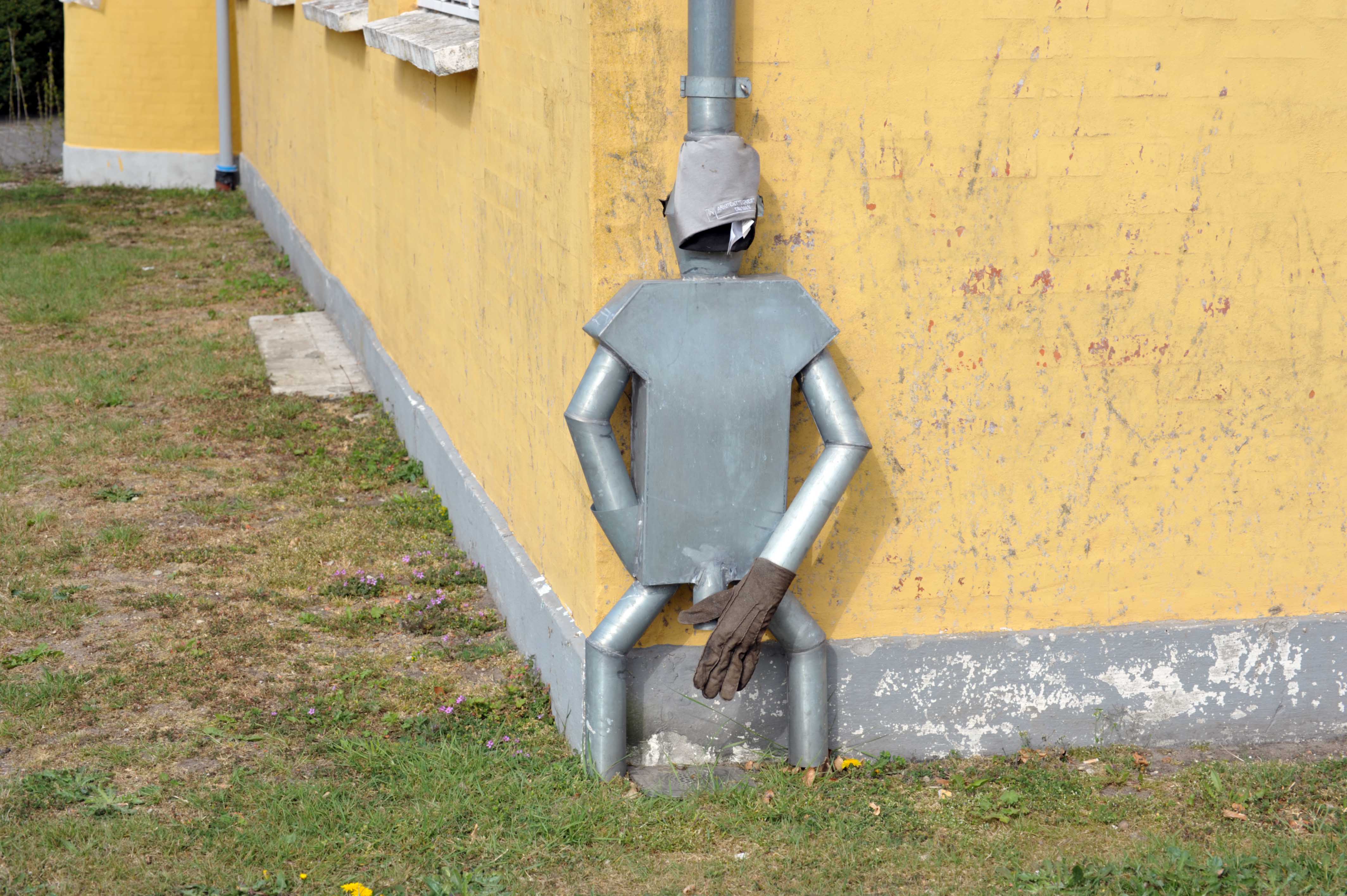 Når man får sig kæmpet igennem Tangevej ved gravearbejdet, og når frem til Valdemar Sejrs Allé finder man et hus med en speciel afslutning på tagrenden – med en lille zinkmand. Den prøver enten at skjule ”det lille rør” med en handske, eller også er det symbolet på, at mænd ofte får skæld ud for at ”strinte” ved siden af. Sjovt fundet på.