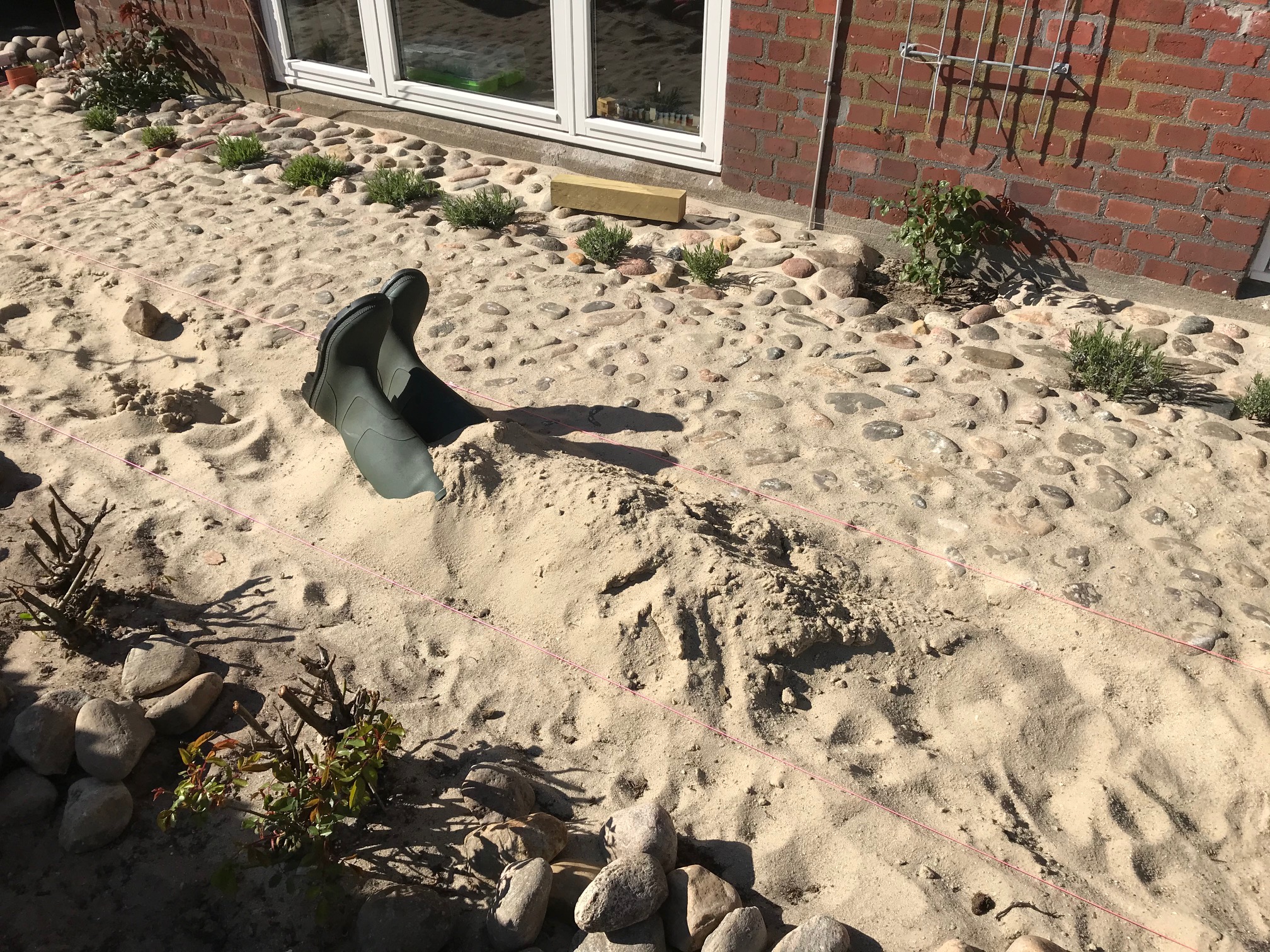 Som det fremgår af billedet, stikker et par støvler ud af en bunke sand/jord. Ved nærmere undersøgelse viser det sig, at det ikke er formanden der ”er gået under jorden”, men et dekorativt indslag fra fruen. Morsomt og sjov fundet på. Formanden fandt vi for øvrigt i haven på en stige. Jørgen er en munter fyr og tager ind i mellem tingene lidt oppe fra.