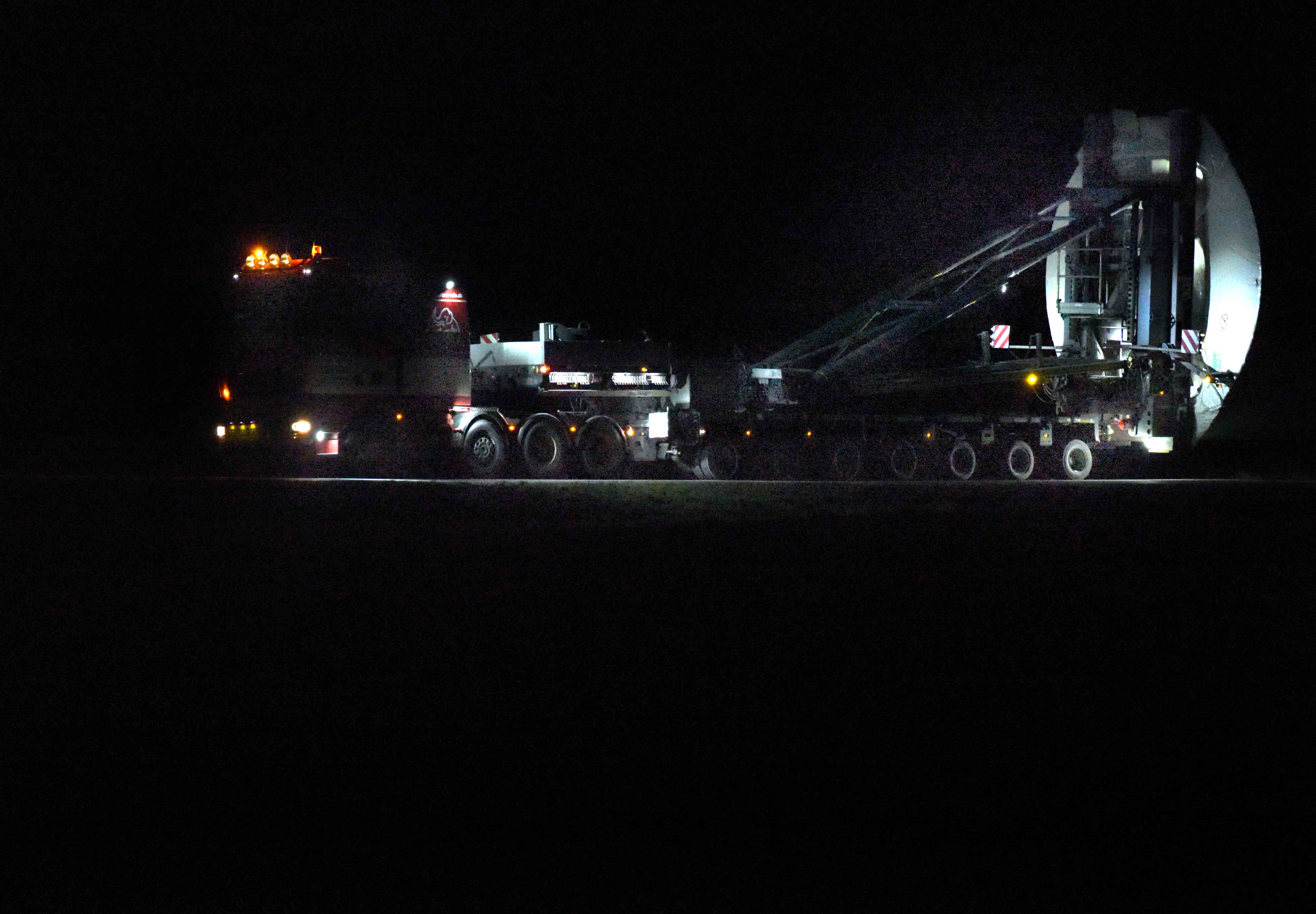 Et sandt lyshav af stationære og blinkende lygter fortæller, at her kommer den store transport med sine ledsagerbiler, og vidste man ikke bedre, kunne man set på afstand tro, at der var tale om et rumskib.