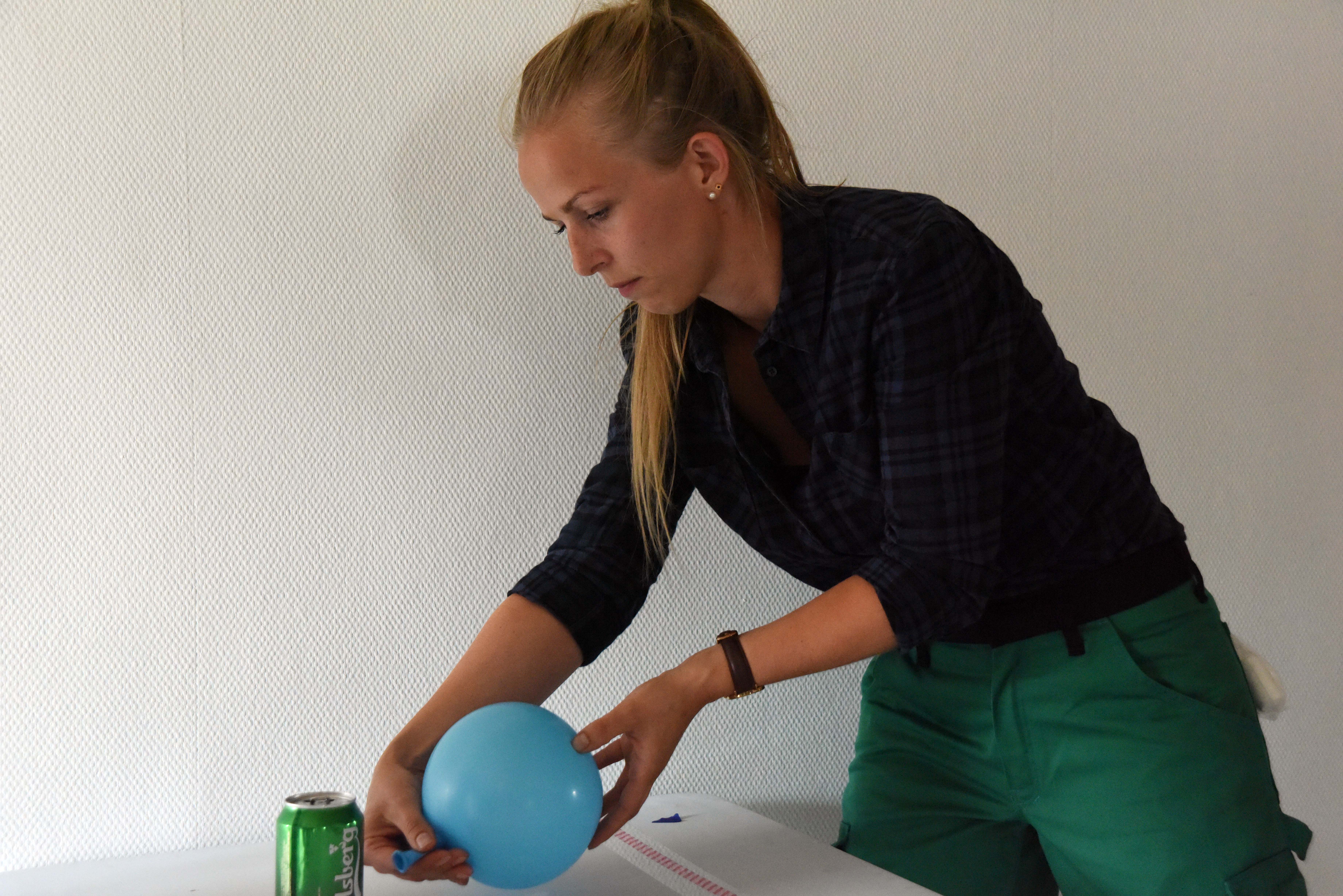 Bedst som strabadserne ved bordet var færdige, gik opgaven videre til næste rum. Her skulle en øldåse flyttes ved hjælp fra luften i en ballon.