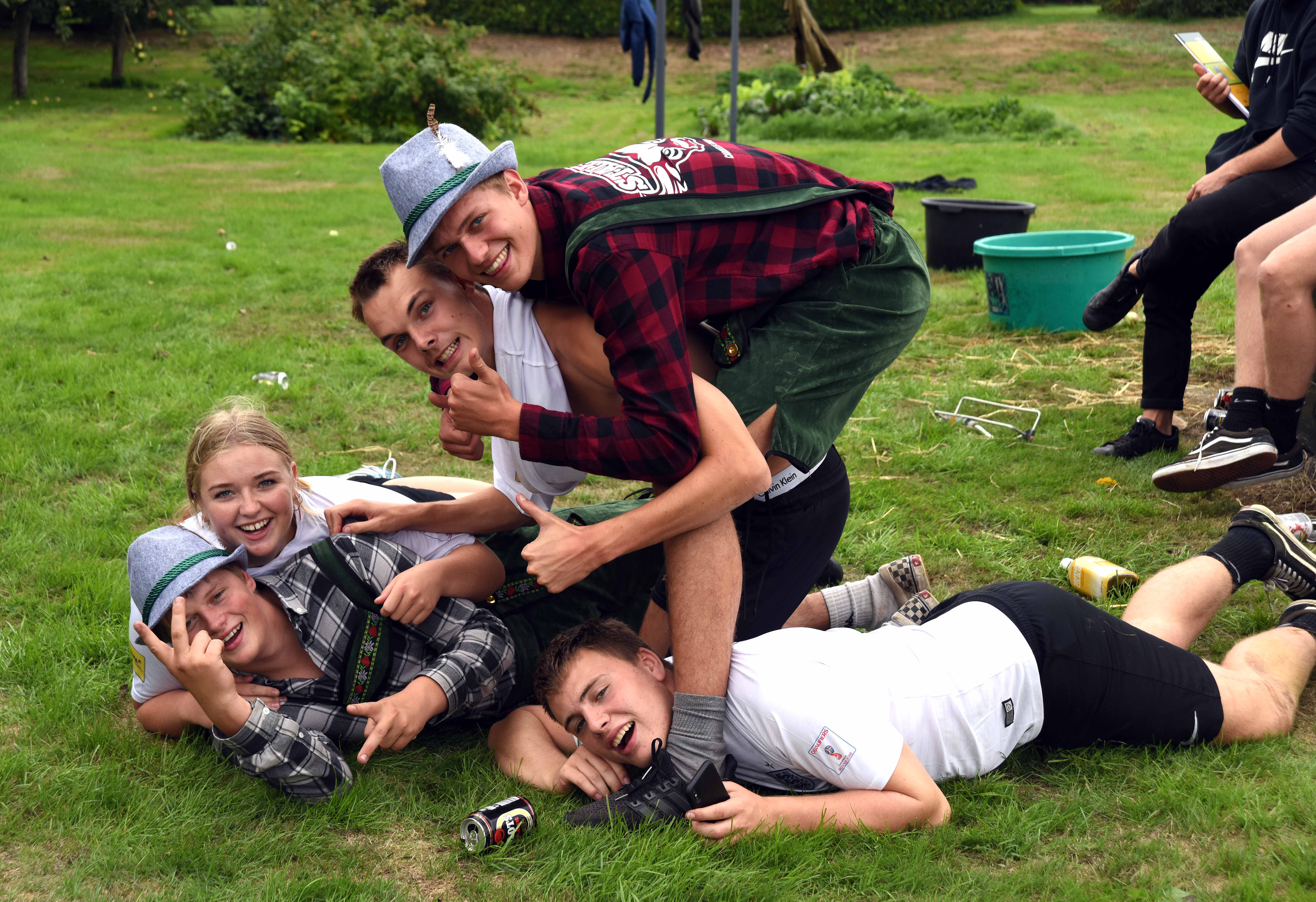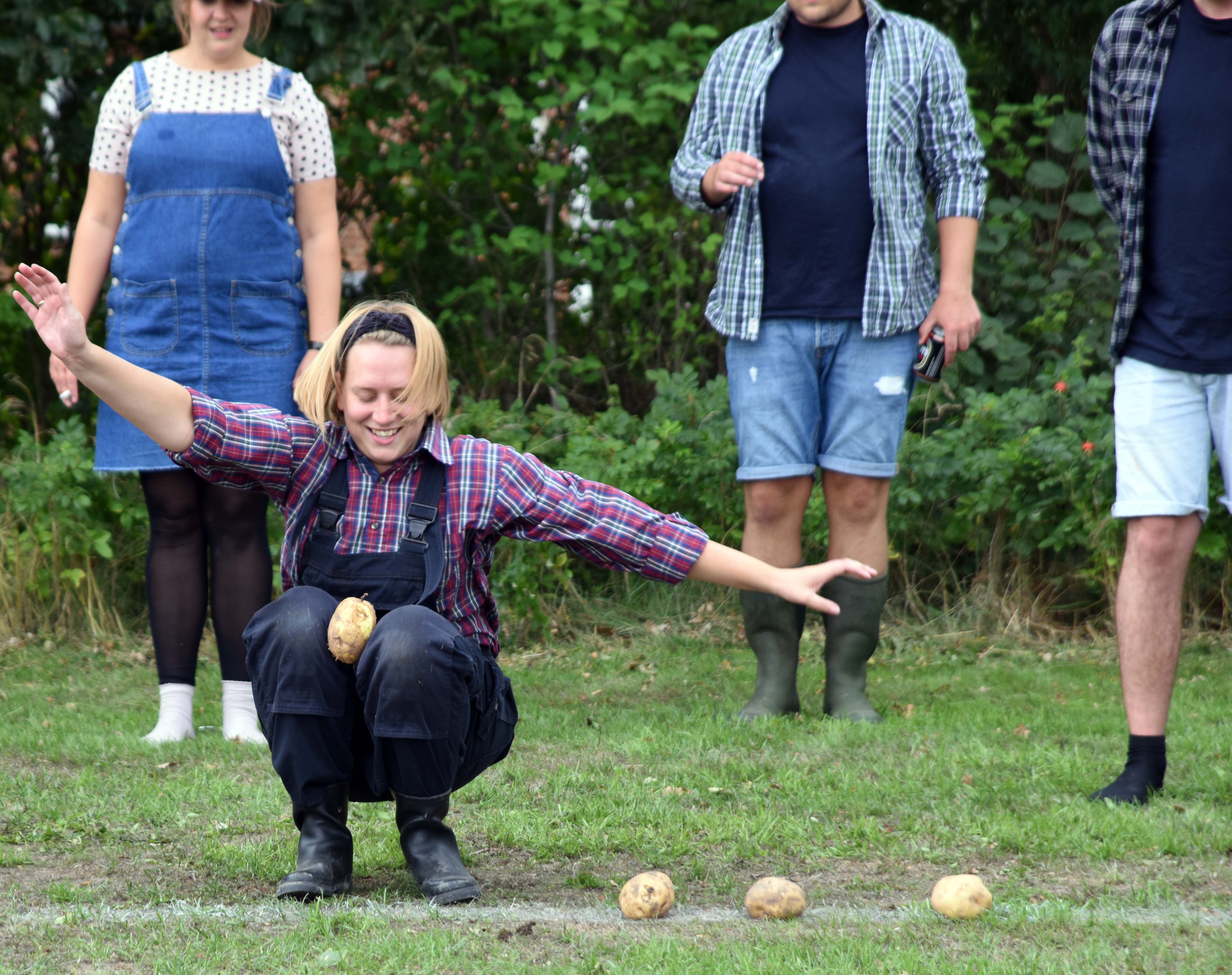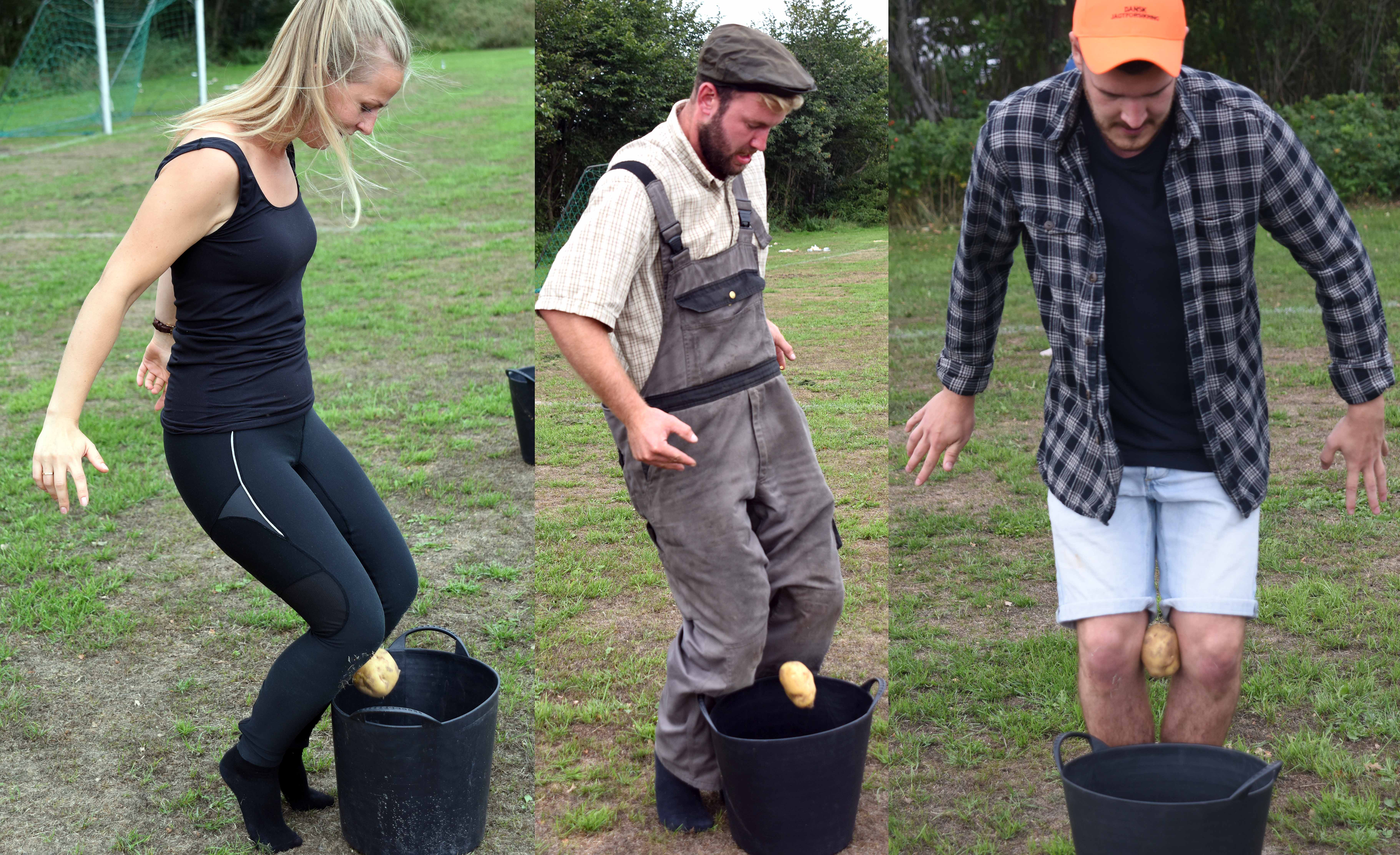 På boldbanen konkurrerede holdene i kartoffelløb. En kartoffel fastklemt mellem knæene og så derudaf – og tabte man kartoflen, så var det bare at starte forfra.
