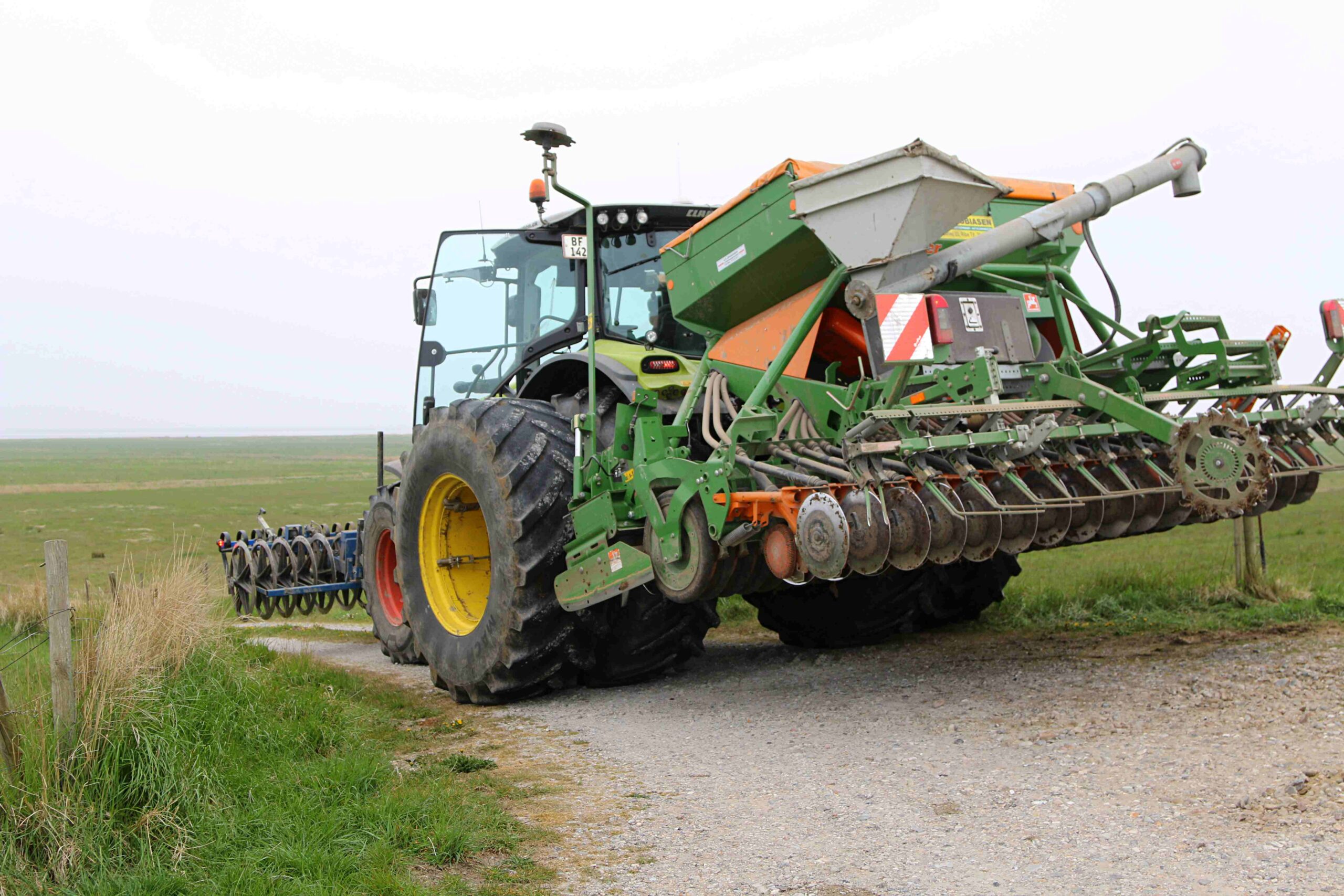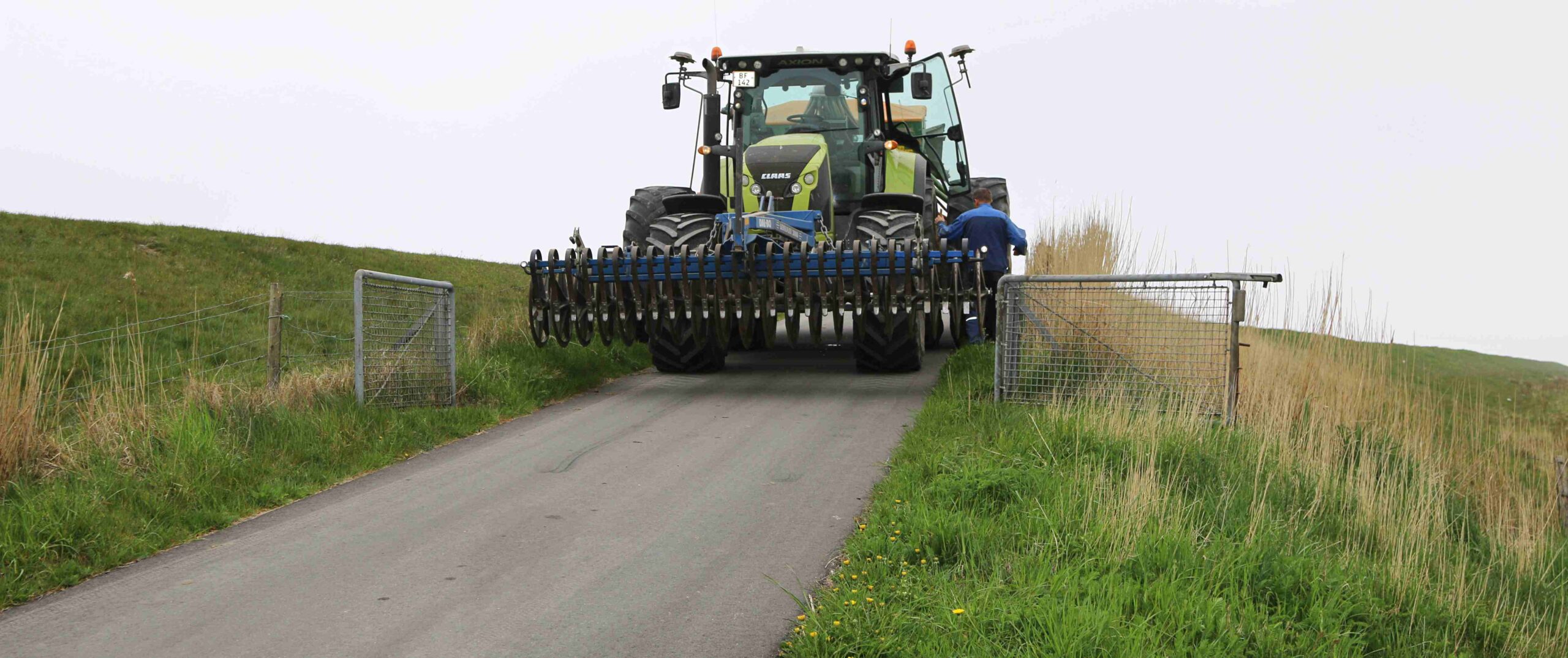 Flemming var i gang med at renovere og efterså græs langs diget fra Ribe Kammersluse til et fløjdige ved Darum – og opgaven svarede til arbejde på 3 ha. – Nogle steder er der hegnet for får – og der må jeg så sikre leddet, inden jeg kan skære græsset og så nyt i en fortløbende proces.