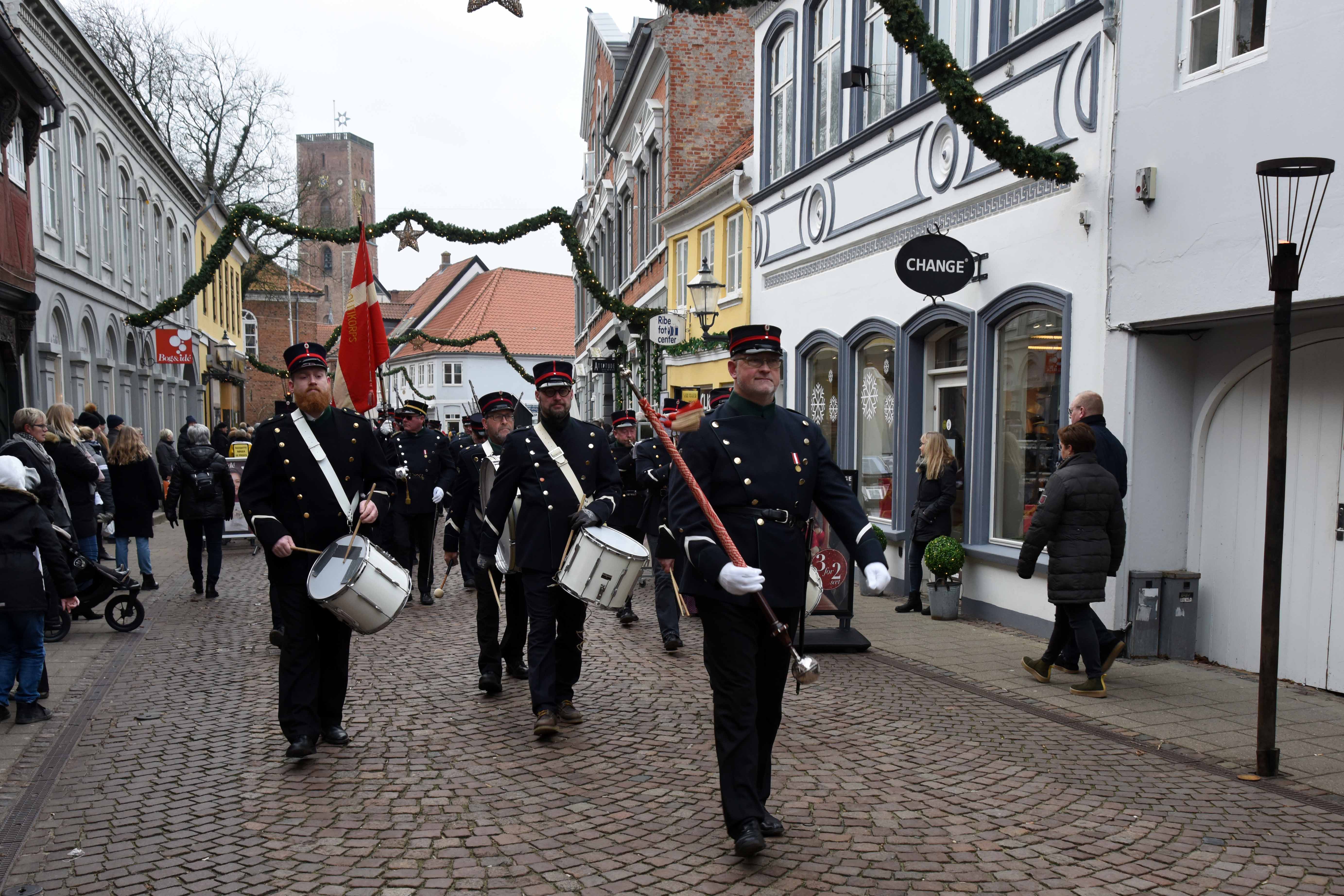 Kl.13.00 lyd musikken i det fjerne og langsomt, men sikkert fik optoget indtaget gågaden, hvor de mange ventende borgere havde taget opstilling. Rigtig mange mennesker var på gaderne i Ribe og snakken gik lystigt.