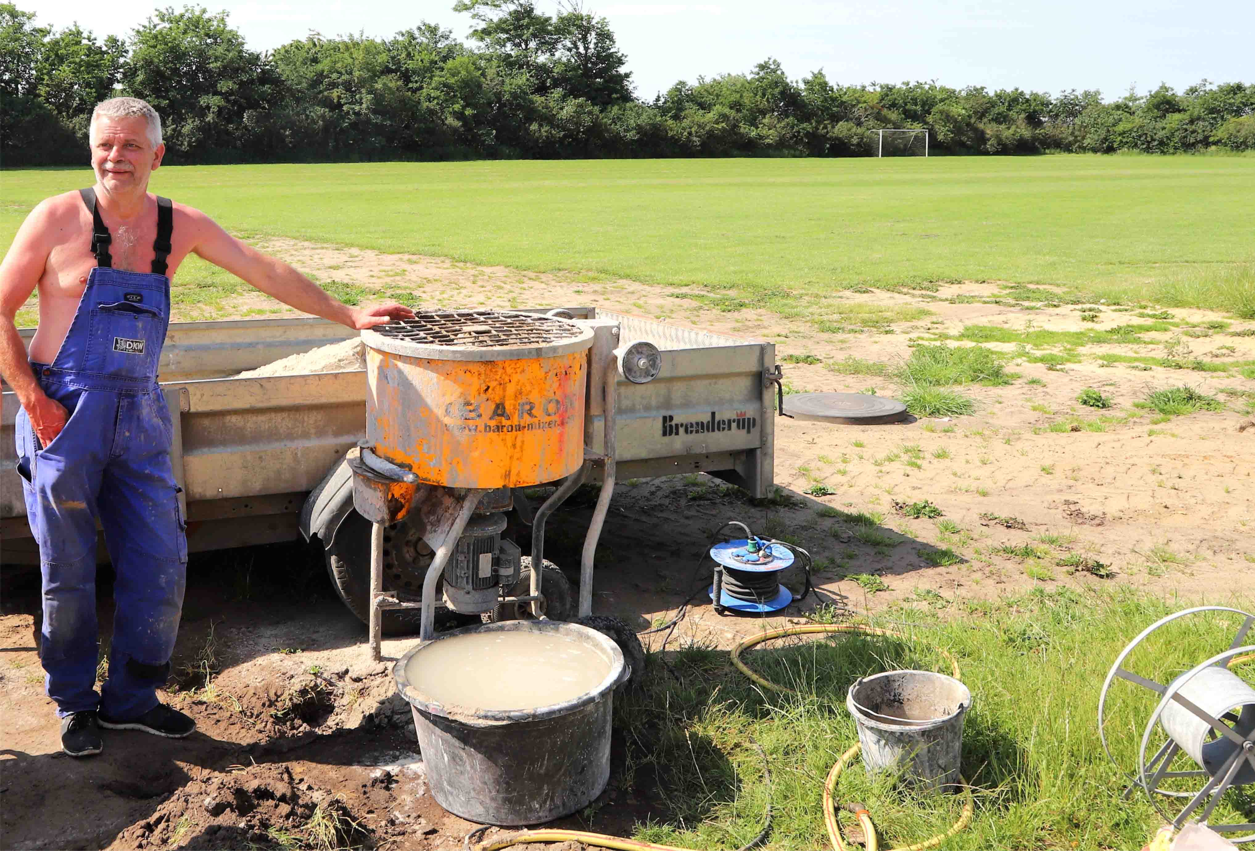 Mads nød det flotte vejr som frivillig arbejdsmand, hvor han skulle holde trit med murernes behov for cement.