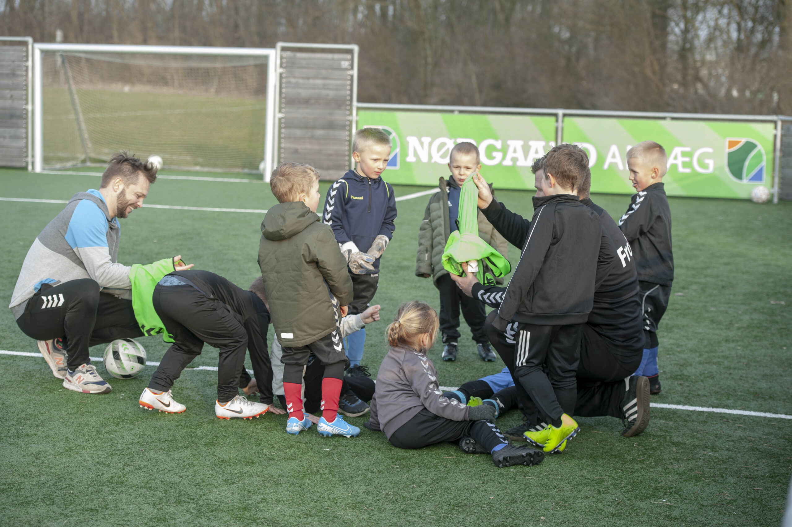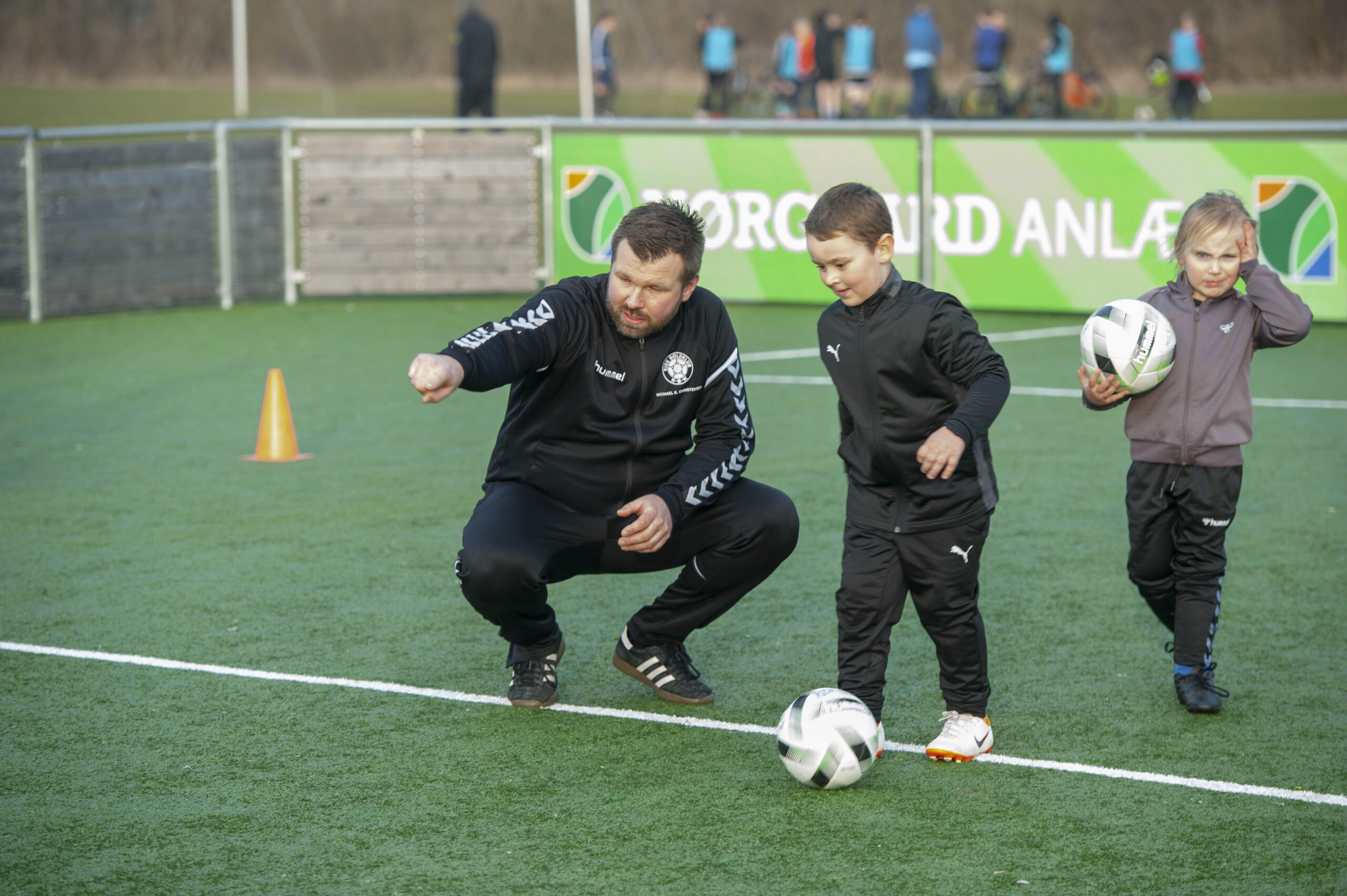 – Kom så Valdemar, lyder fra en af de to trænere, der er i gang med at få børnene til at samarbejde lidt om bolden.