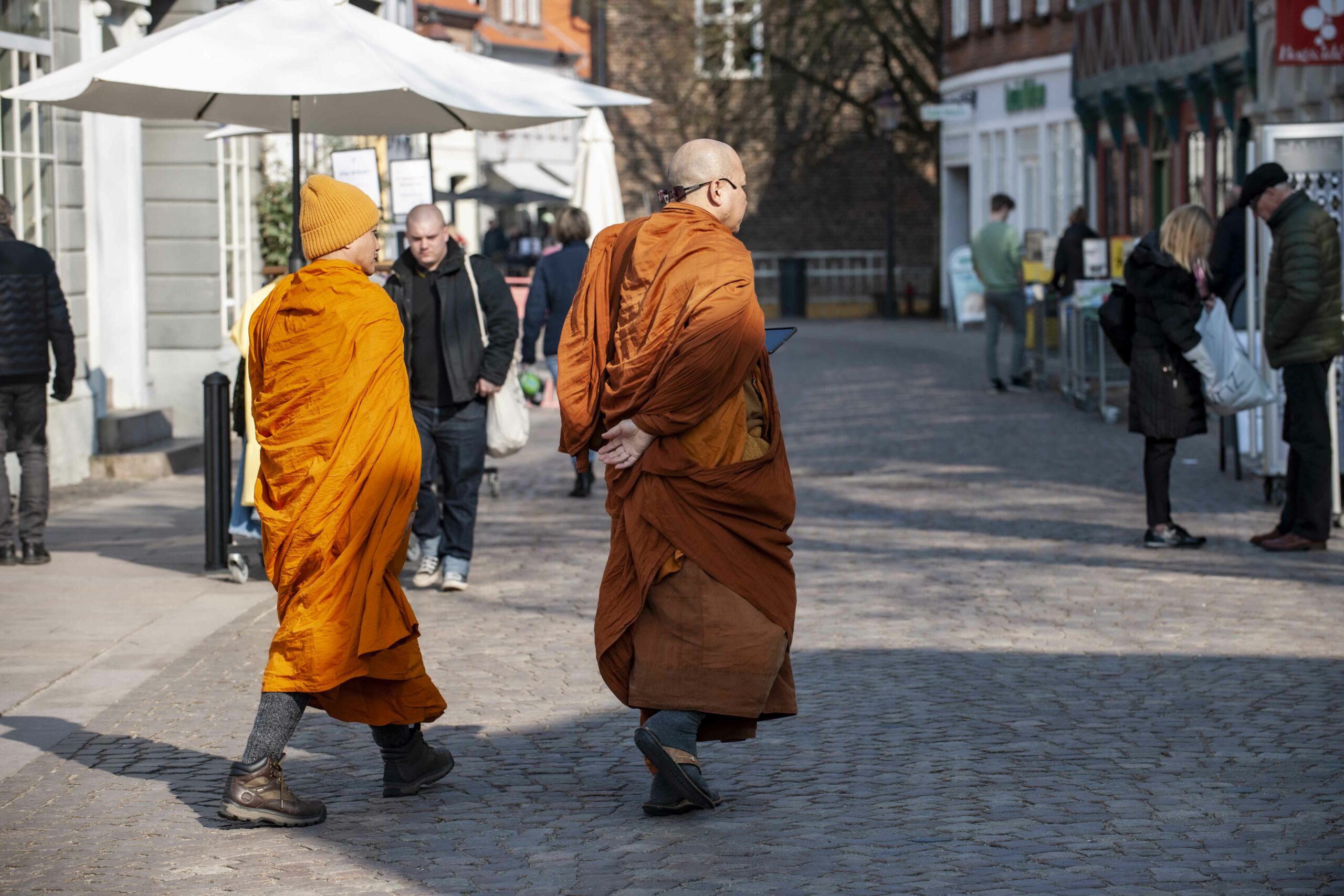 Så var der de to munke, som besøgte byen efter deres ophold i templet i Spandet. Butikkernes facader, baggårde og de gamle huse blev grundigt studeret.