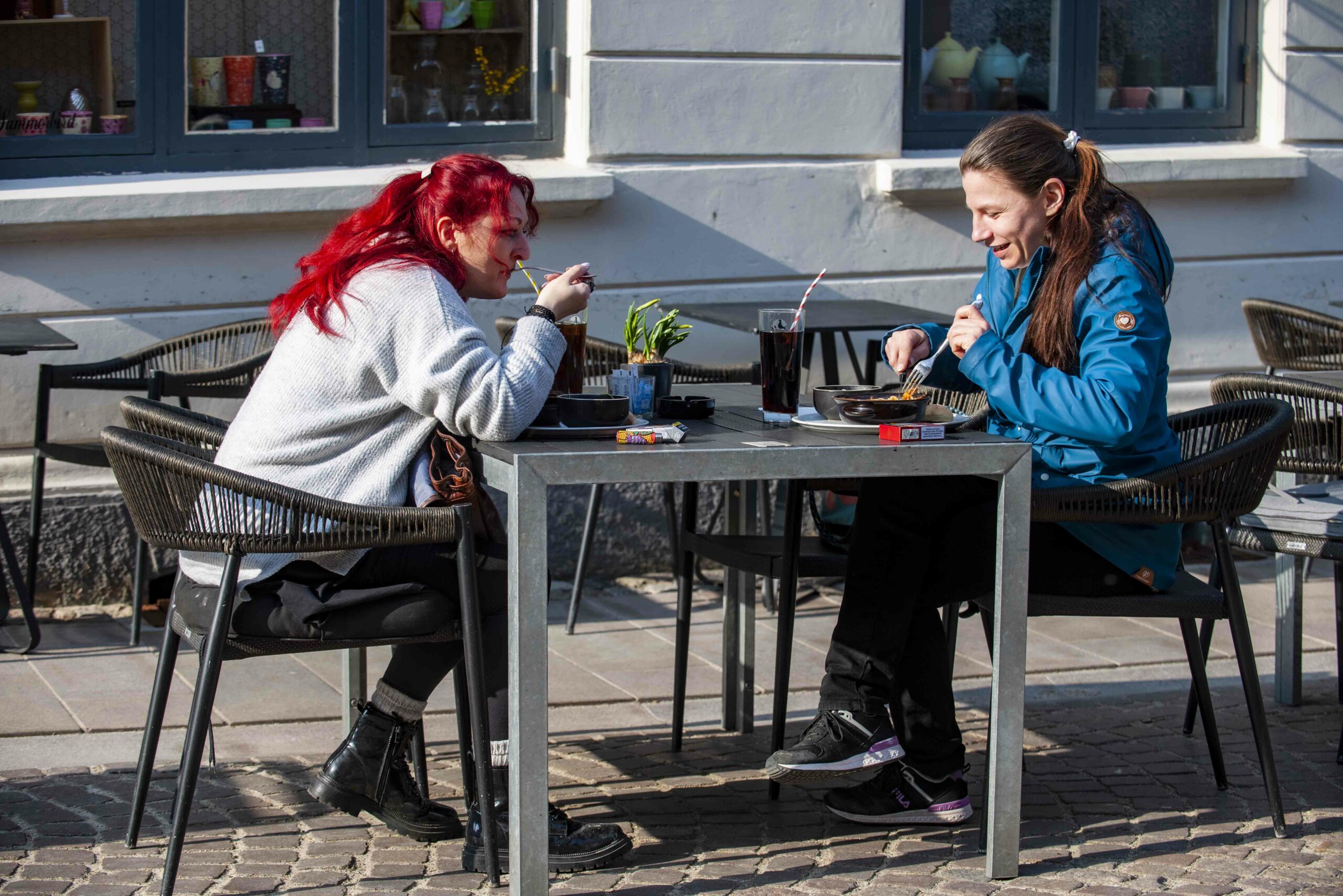 De 12 graders varme og solskin kunne få gæsterne i byen til at nyde frokosten udendørs. På rest. Pinocchio var der borde ude. Det havde lokket to tyske kvinder til at nyde frokosten. Forsætter det gode vejr, kommer de sikkert igen, for ferien i Ribe er planlagt til en uge.