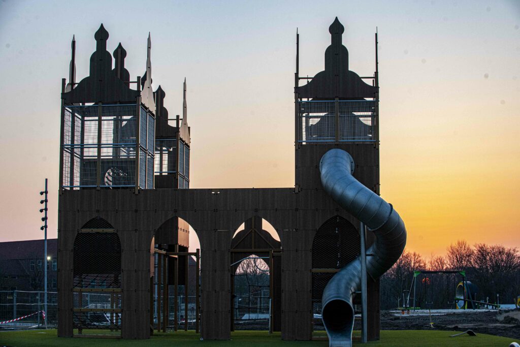 Vi slutter turen af på den nye Aktivitets og legeplads ved Ribe Fritidscenter, der går arbejdet hurtigt fremad. Belægningen på løbestierne er ved at blive etableret og fald-underlaget ved redskaber,enten fra de 23.000 par Nike sko eller kunstgræsset. Farvespillet er meget flot. LED lyset er ved blive sat op, og arbejdet med færdiggørelsen går godt. Det gode vejr gør måske også, at rullegræsset snart kan komme på.