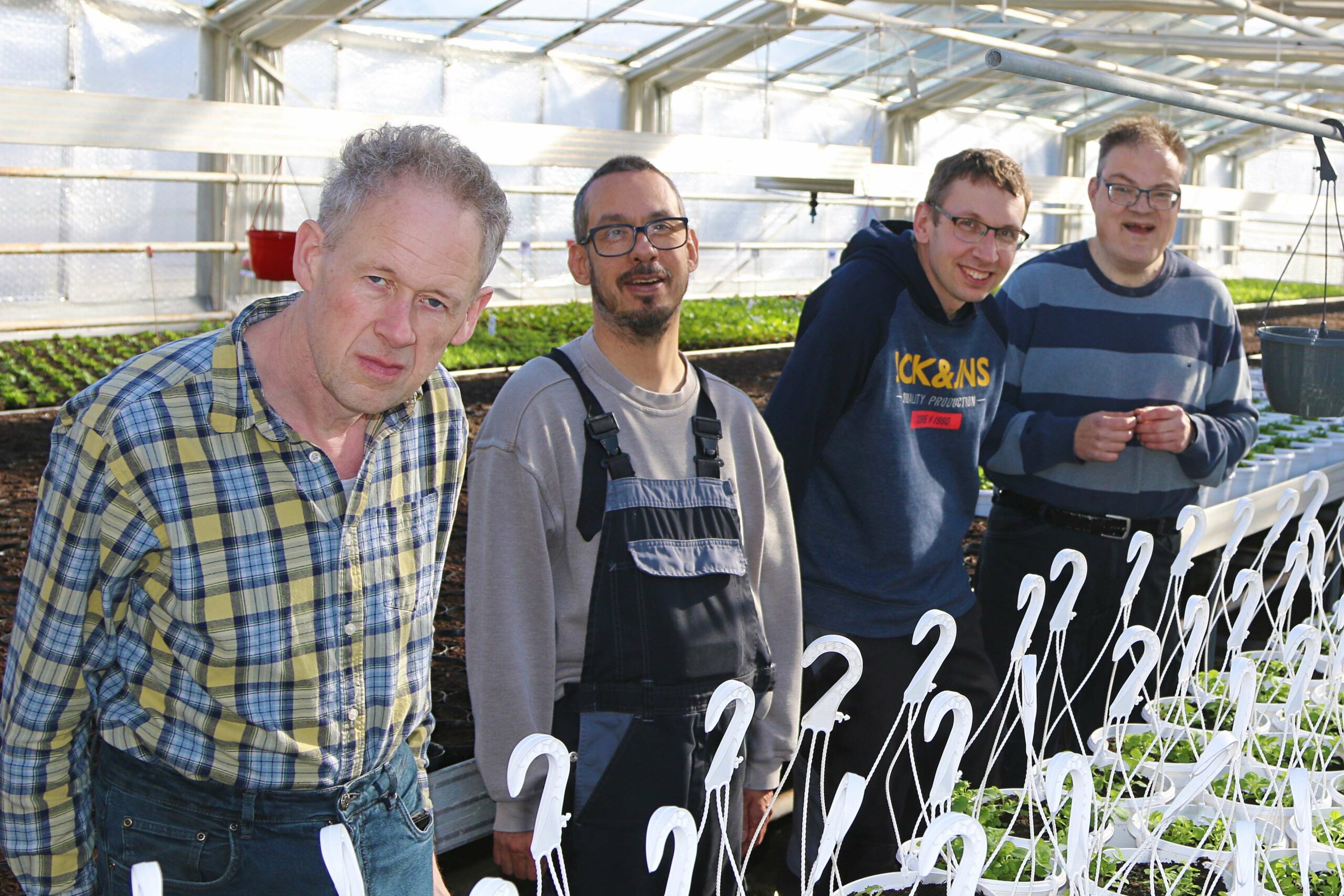 I butikken, i drivhusene og ikke mindst ved bordene, hvor der skal sås frø og ordnes planter, kan du møde fire friske fyre, som altid er i godt humør og parat til at hjælpe. Derfor er det altid en fornøjelse at være på besøg.