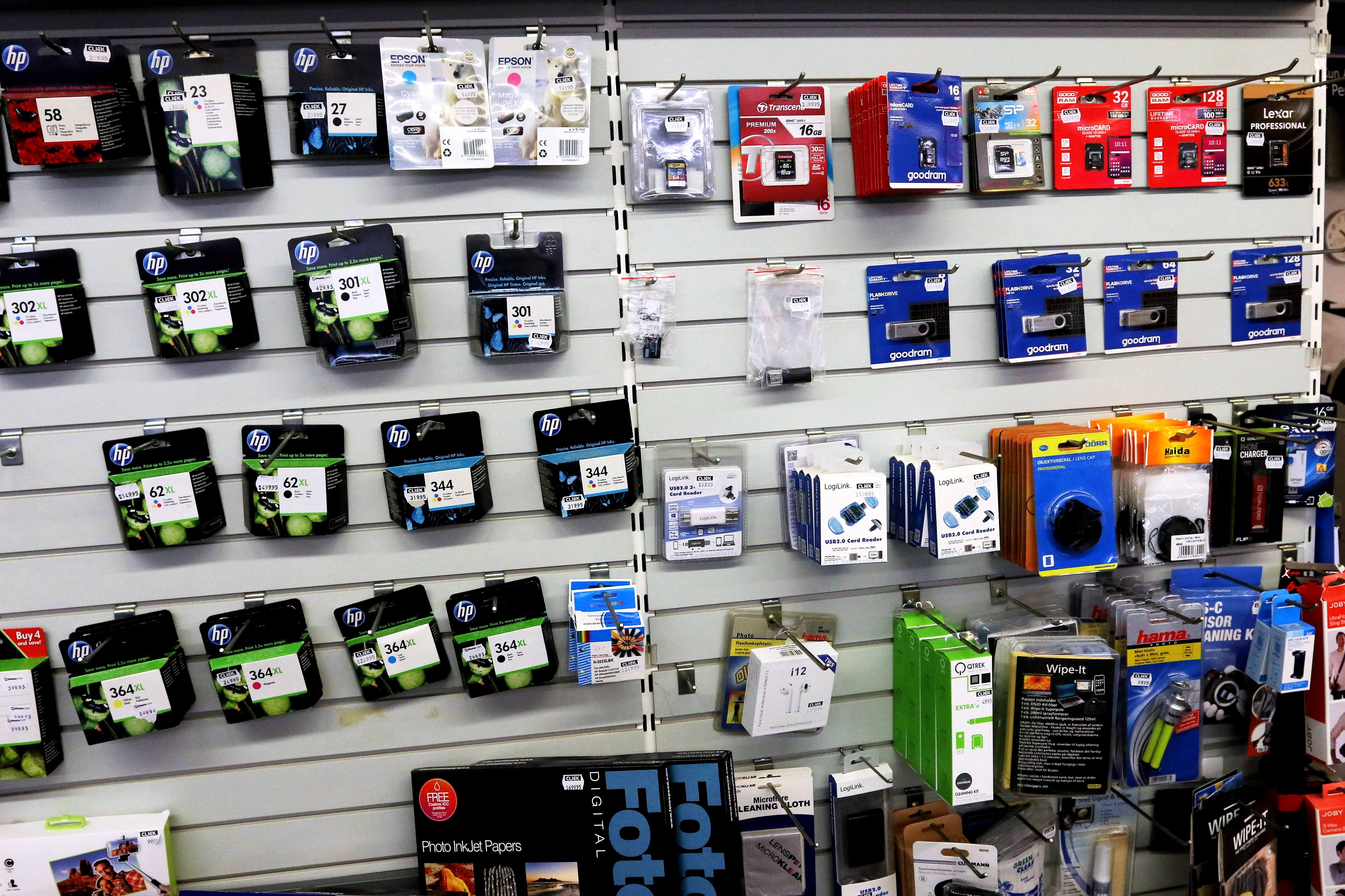 Frank byder ikke på varer som blækpatroner – kort til kamera etc, der er skadet af sod (demofoto fra butikken i Esbjerg).