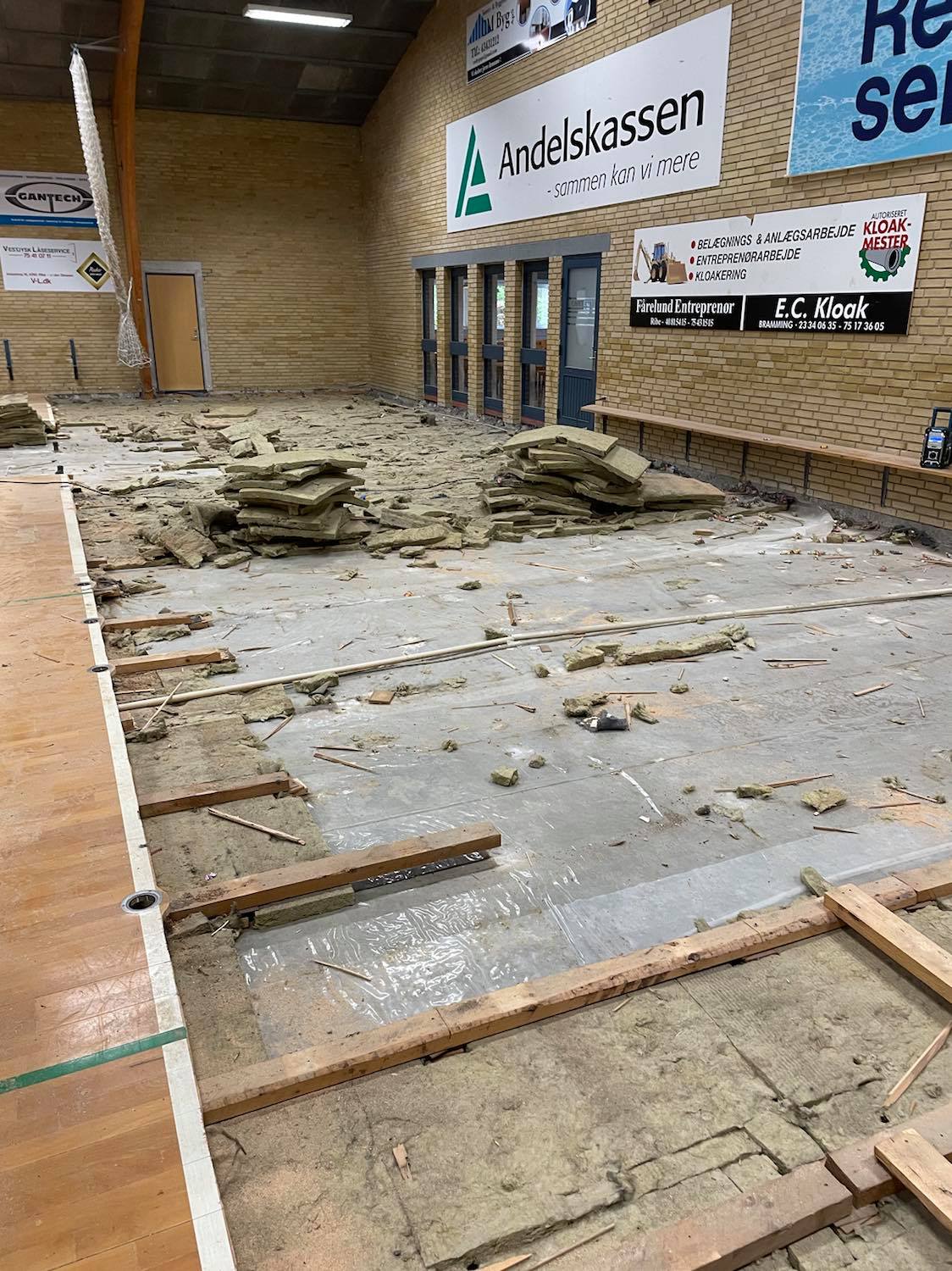 I pinsedagene er frivillige begyndt at fjerne gulvet i Kongeåhallens store hal. – Det er en kæmpeopgave, fortæller halinspektør Erik Knudsen, der har sørget for mad og drikke til de aktive. – Der skal fjernes omkring 1200 m2 gulv, strøer og isolering samt plastik, forklarer halinspektøren, der kan oplyse, at de frivillige hjælpere får en del af gulvet til eget brug. Mon ikke der er nogle, der er set nybygger-TV, og derfor vil lave fx. et spisebord med streger fra fx. målfeltet eller badmintonbanen som autentisk dekoration?