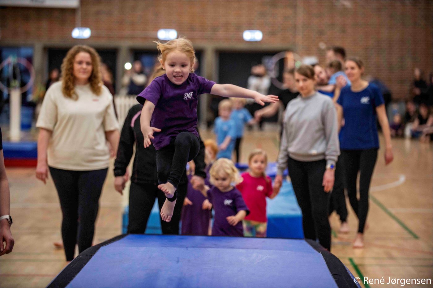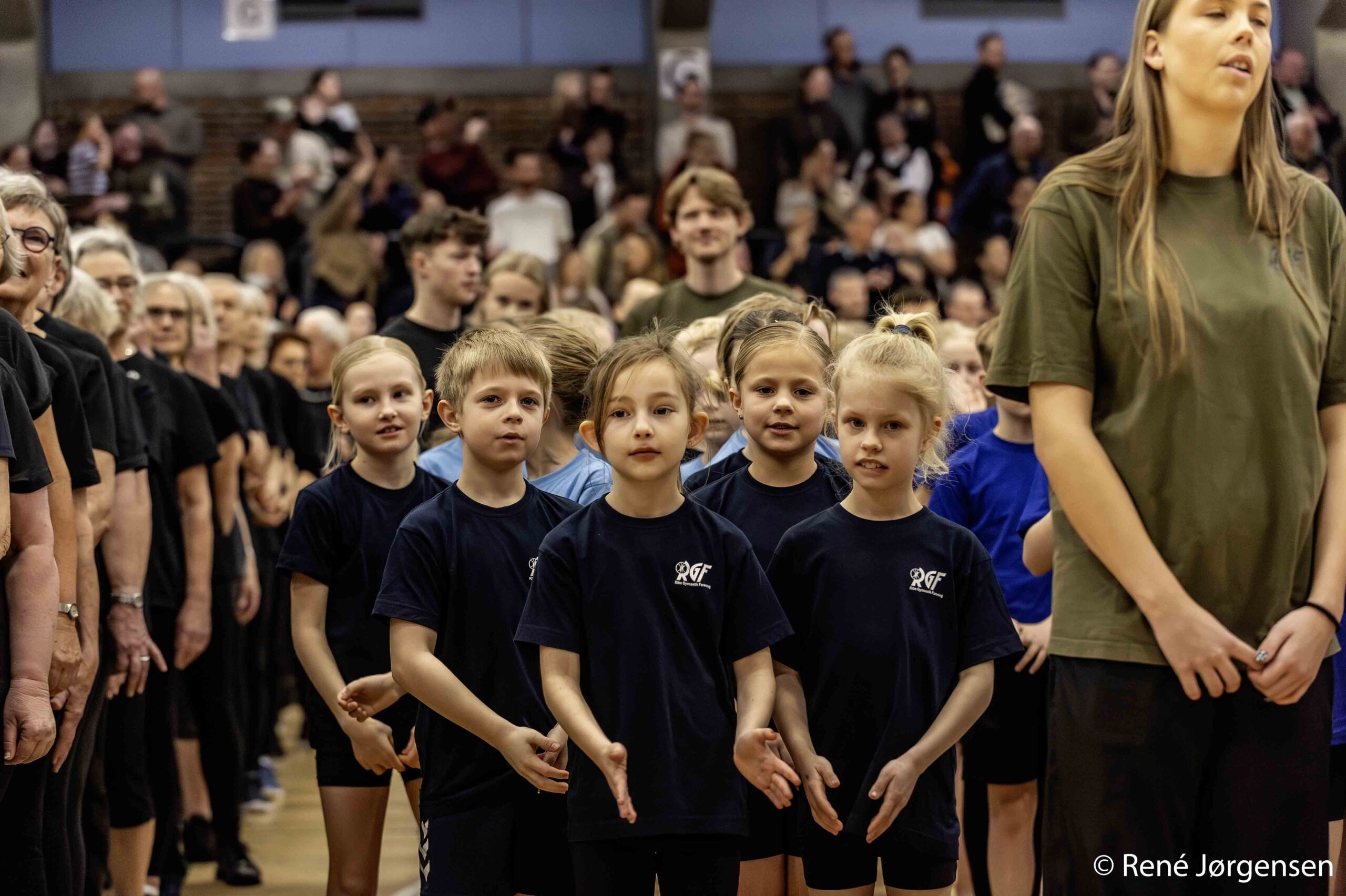 Ved indgangen til hallen stod de yngste gymnaster klar i farvestrålende trøjer. Mange af dem med spænding i blikket, mens de ventede på at gå ind i hallen – hånd i hånd med mor eller far. Samtidig sad stolte forældre og bedsteforældre klar på tribunerne.