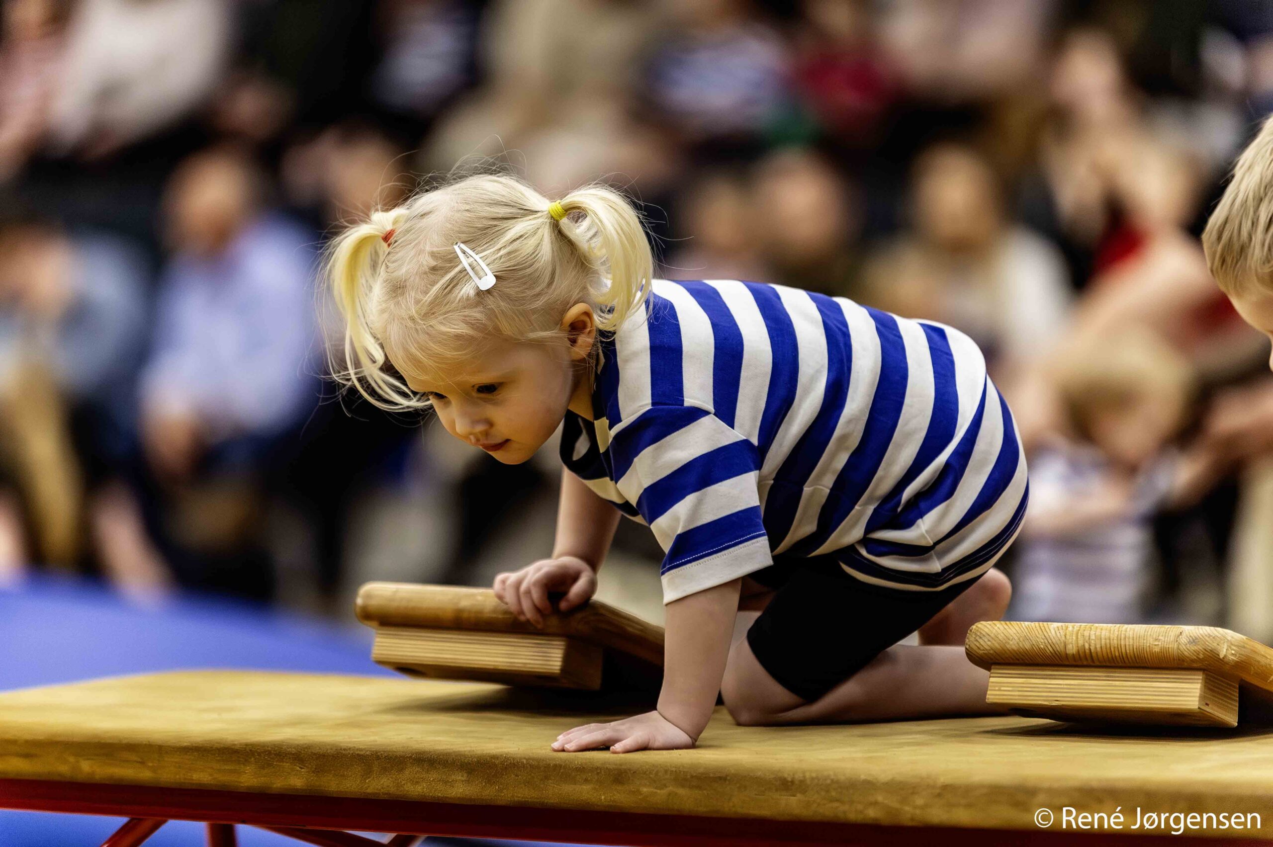 Ved indgangen til hallen stod de yngste gymnaster klar i farvestrålende trøjer. Mange af dem med spænding i blikket, mens de ventede på at gå ind i hallen – hånd i hånd med mor eller far. Samtidig sad stolte forældre og bedsteforældre klar på tribunerne.