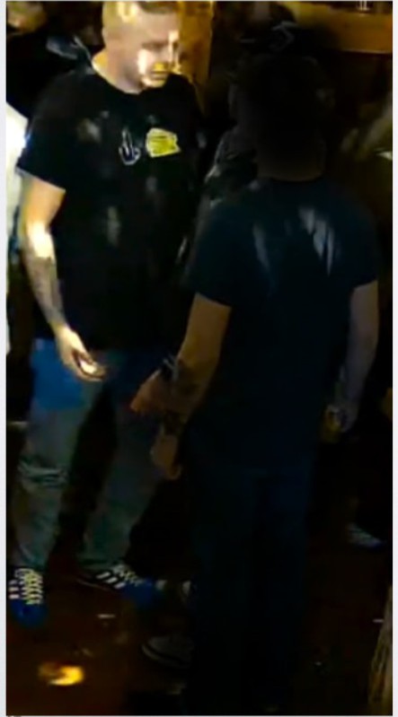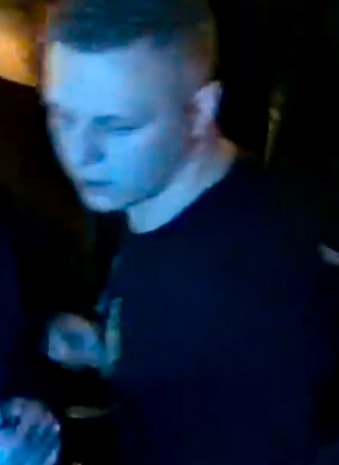 Han beskrives som: mand med kort lyst hår iført sort T-shirt med gult logo, blå jeans og blå Adidas-sko. Højre arm er tatoveret.