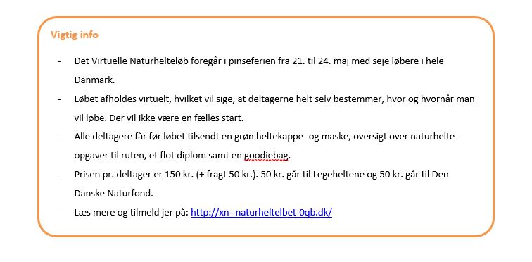 Ved at deltage i Det Virtuelle Naturhelteløb støtter man både Legeheltene og Den Danske Naturfond med 50 kr. hver.
