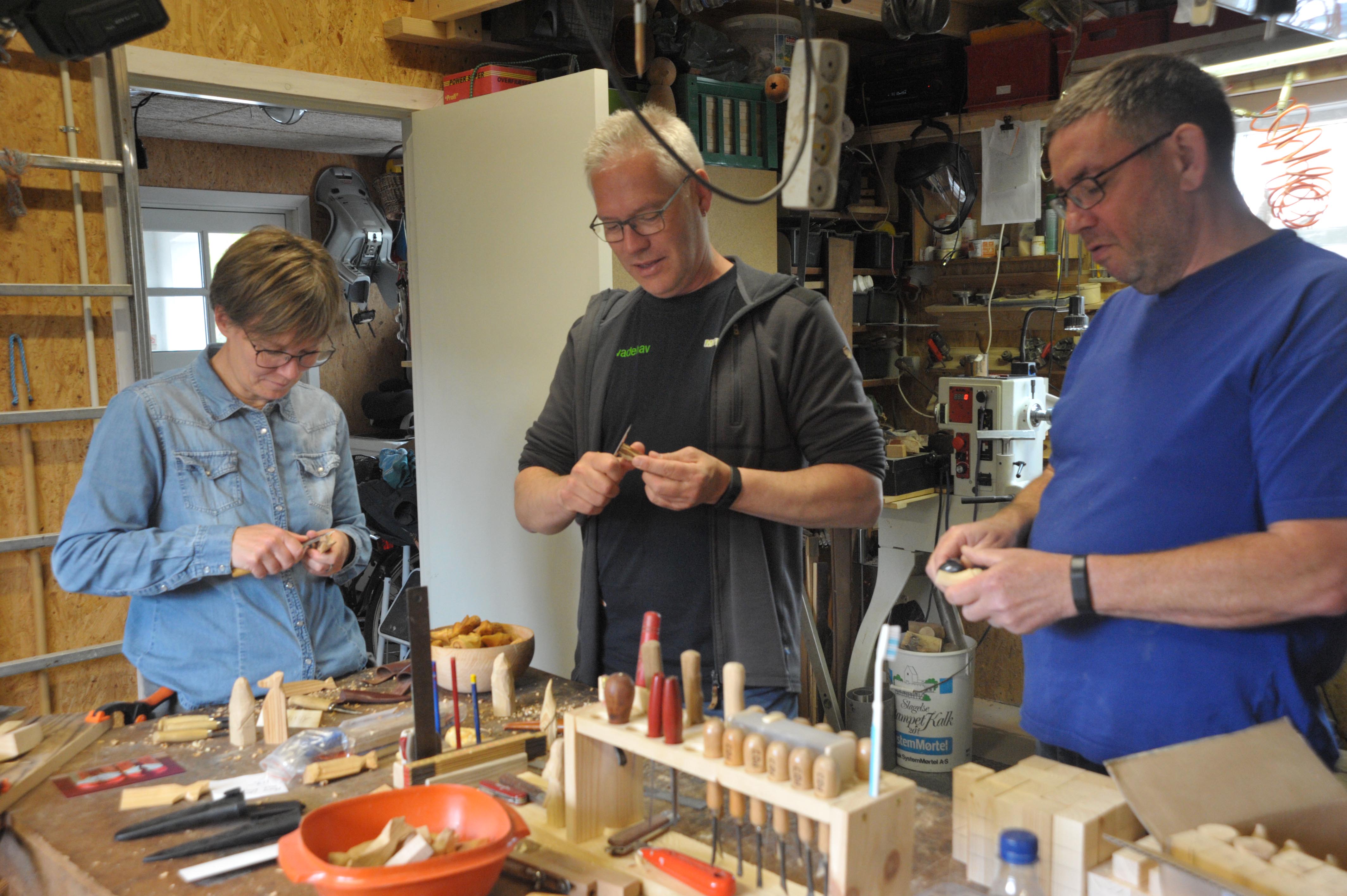 I værkstedet møder vi Trine Brander og Jan Ryttergaard fra Skoletjenesten i Sortebrødregade. De er i gang med snittearbejdet og vil gerne tilegne sig noget af Pers viden om arbejdet, så rigtig mange børn kan få glæde af snitteriet i skoletjenesten.