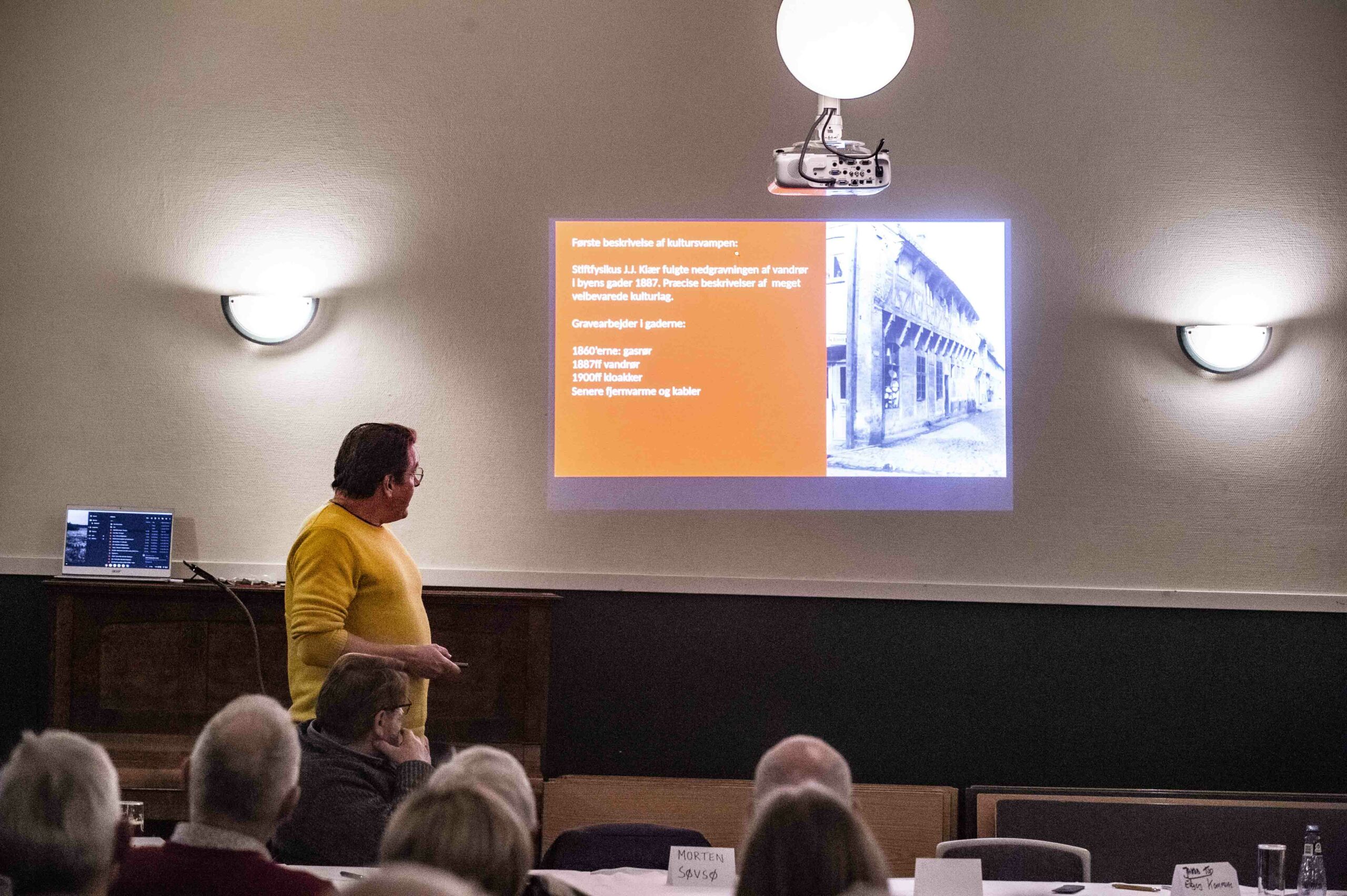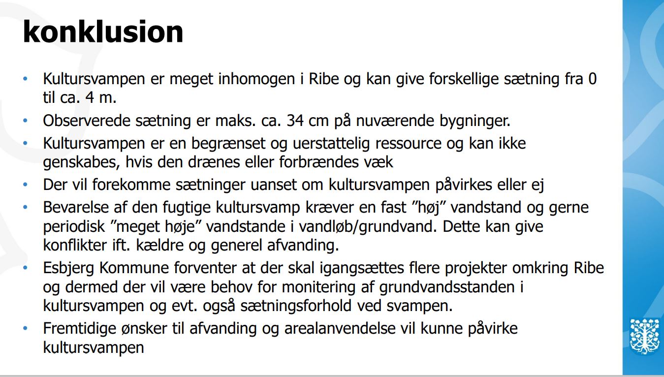 Med illustrationer viste Morten bla. sætningsskader i Toldboden (prøv selv at se på bygningen, næste gang du kommer forbi). – I det 20 århundrede er højdepunkter sunket 14 centimeter, var et af de faktuelle data, sammen med budskabet om, at der er virkelig skidt for kultursvampen, at vandspejlet i Ribe Vesterå er faldet, så der i sommermåned kan ses murbrokker ved Skibbroen.