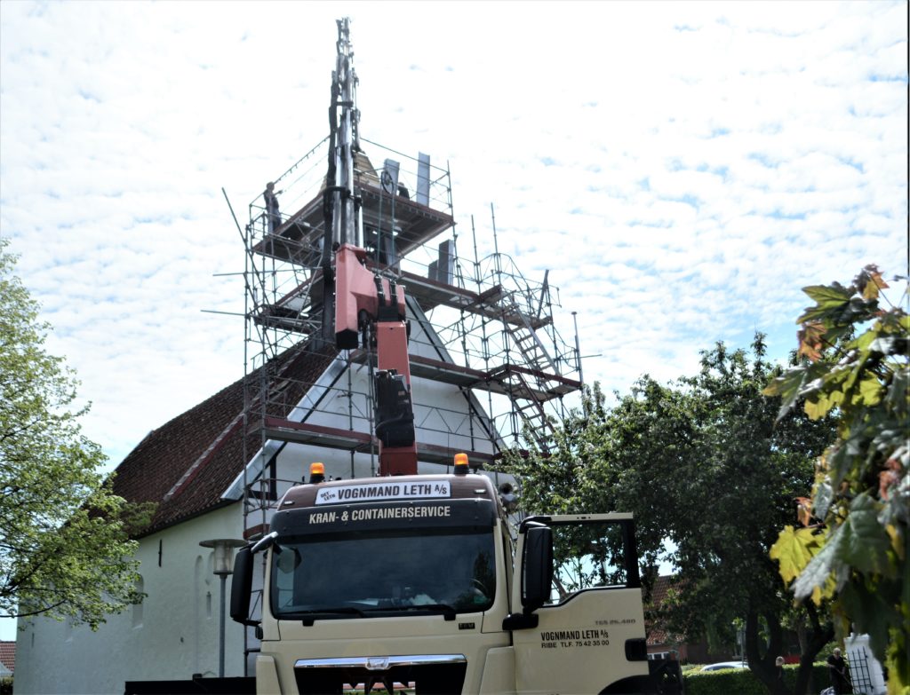Spiret vejer anslået omkring 50 kg, og da det skulle løftes omkring 20 meter i vejret, blev vognmand Preben Leth, Ribe, tilkaldt med en stor mobilkran, der med bravur klarede opgaven for CM Byg, der står for hovedentreprisen.