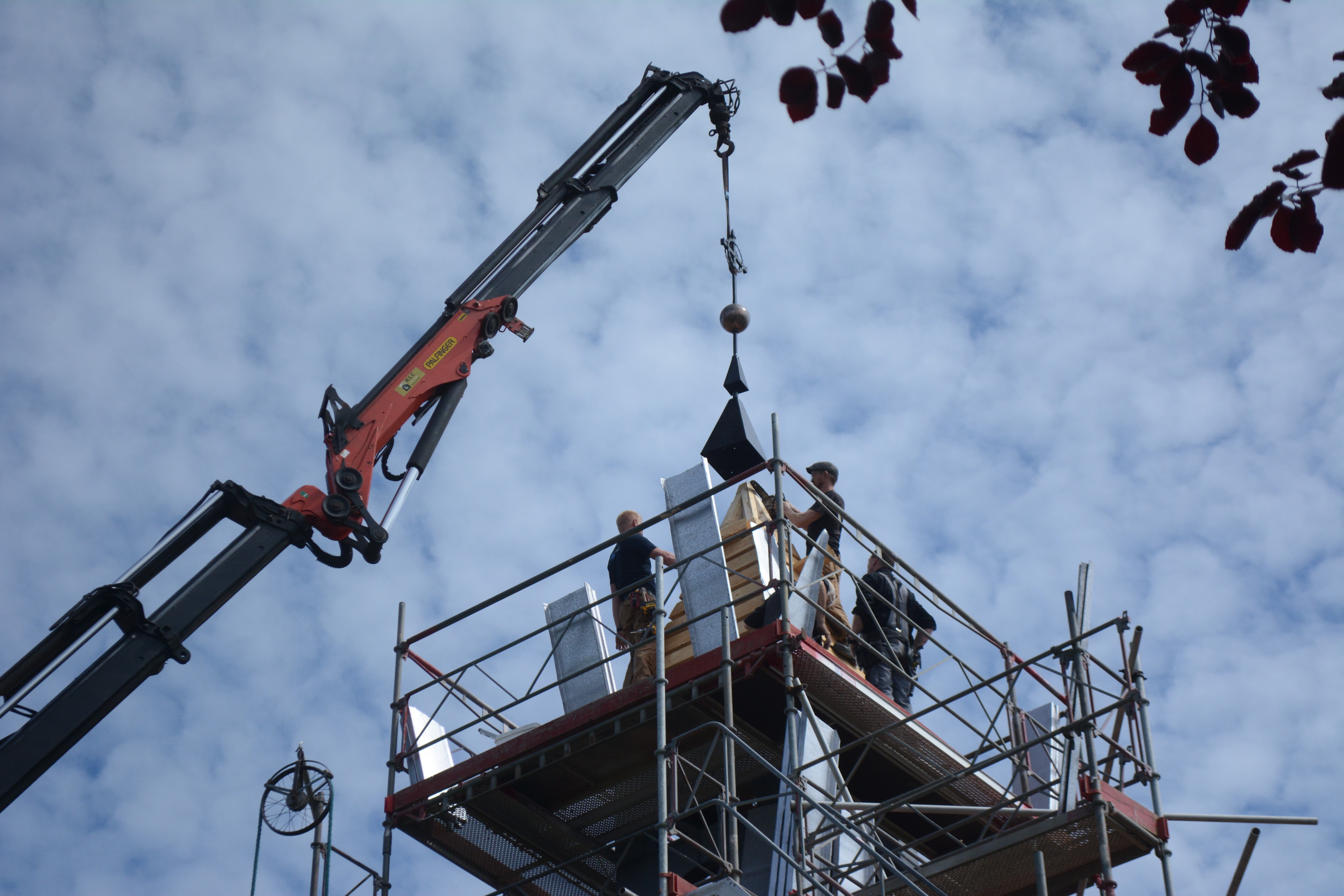 Vognmand Leths store kran klarede nemt opgaven med at sætte det nye spir på plads 20 meter over jorden.