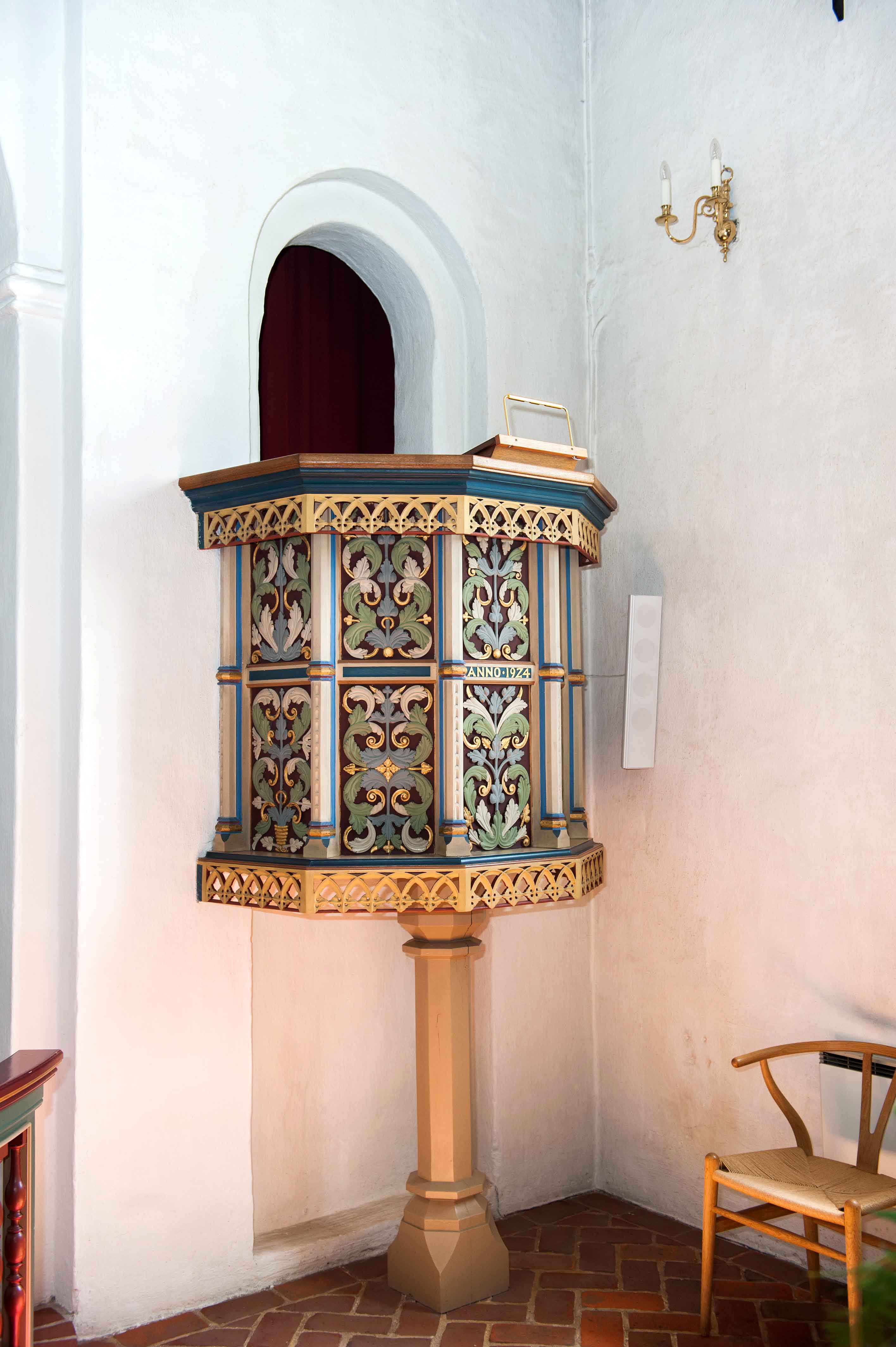 … prædikestol (foto: Esbjerg Byhistoriske Arkiv / Torben Meyer). Bemærk årstallet 1924 – året før kirken blev taget i brug.