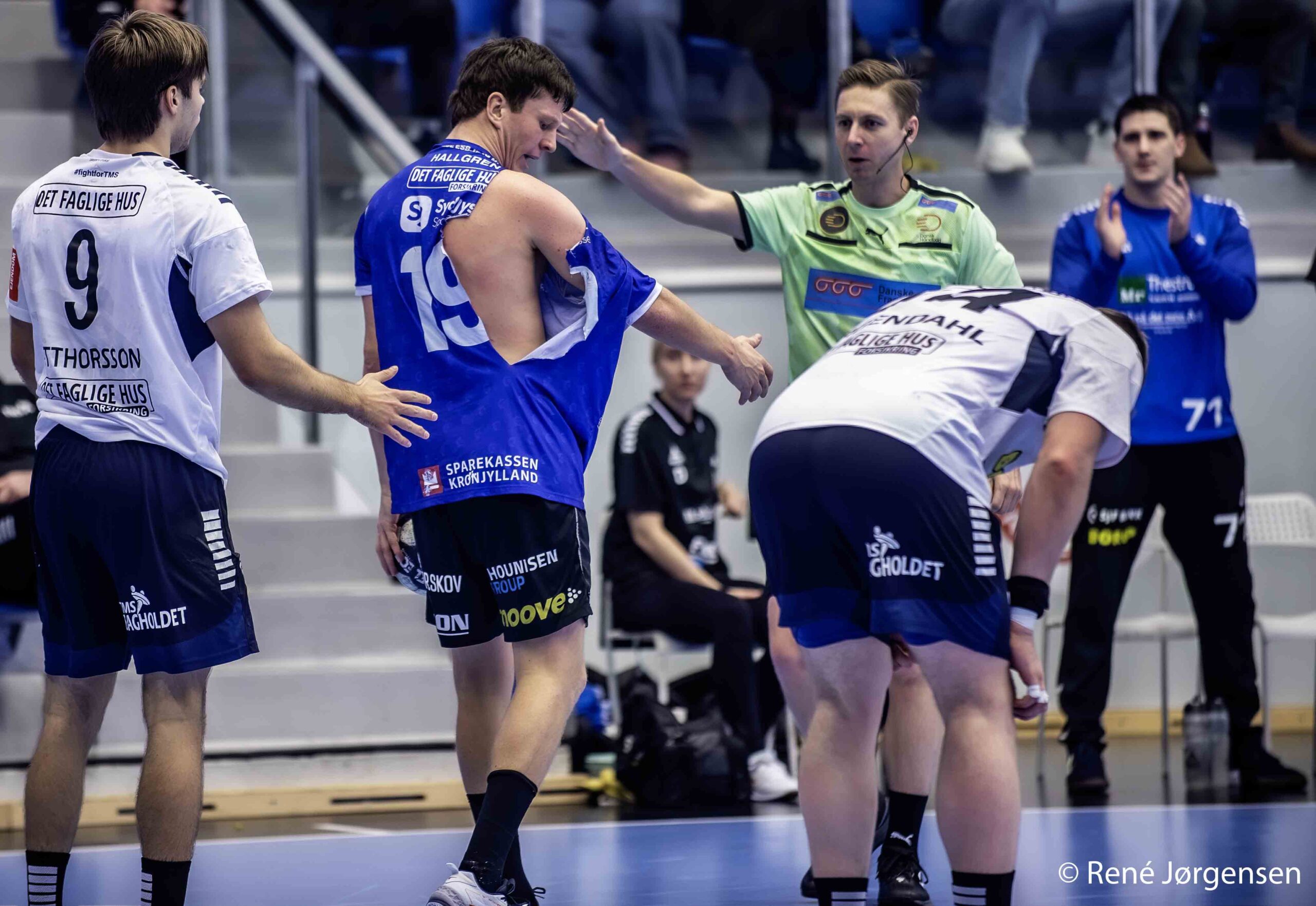Ved stillingen 23-24 til TMS Ringsted får Ribe-Esbjerg HH’s Laurits Legér en 2 minutters udvisning og TMS et straffekast. Om Laurits Legér på vej ud har sagt et eller andet til dommerne eller kampens observatør Jørgen Møller Nielsen vides ikke, men i hvert fald tildeler observatøren Laurits Legér yderligere 2 minutters straf.