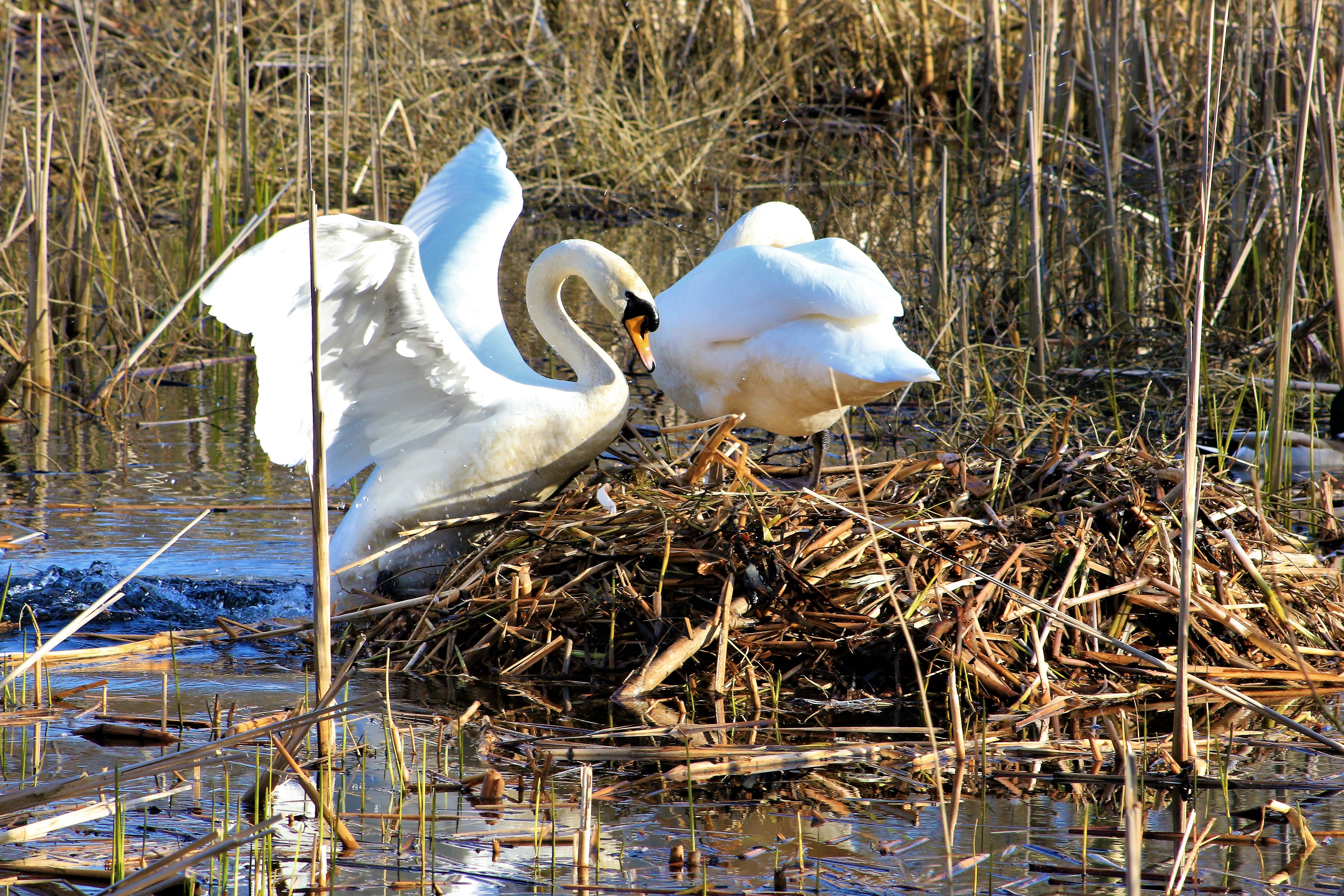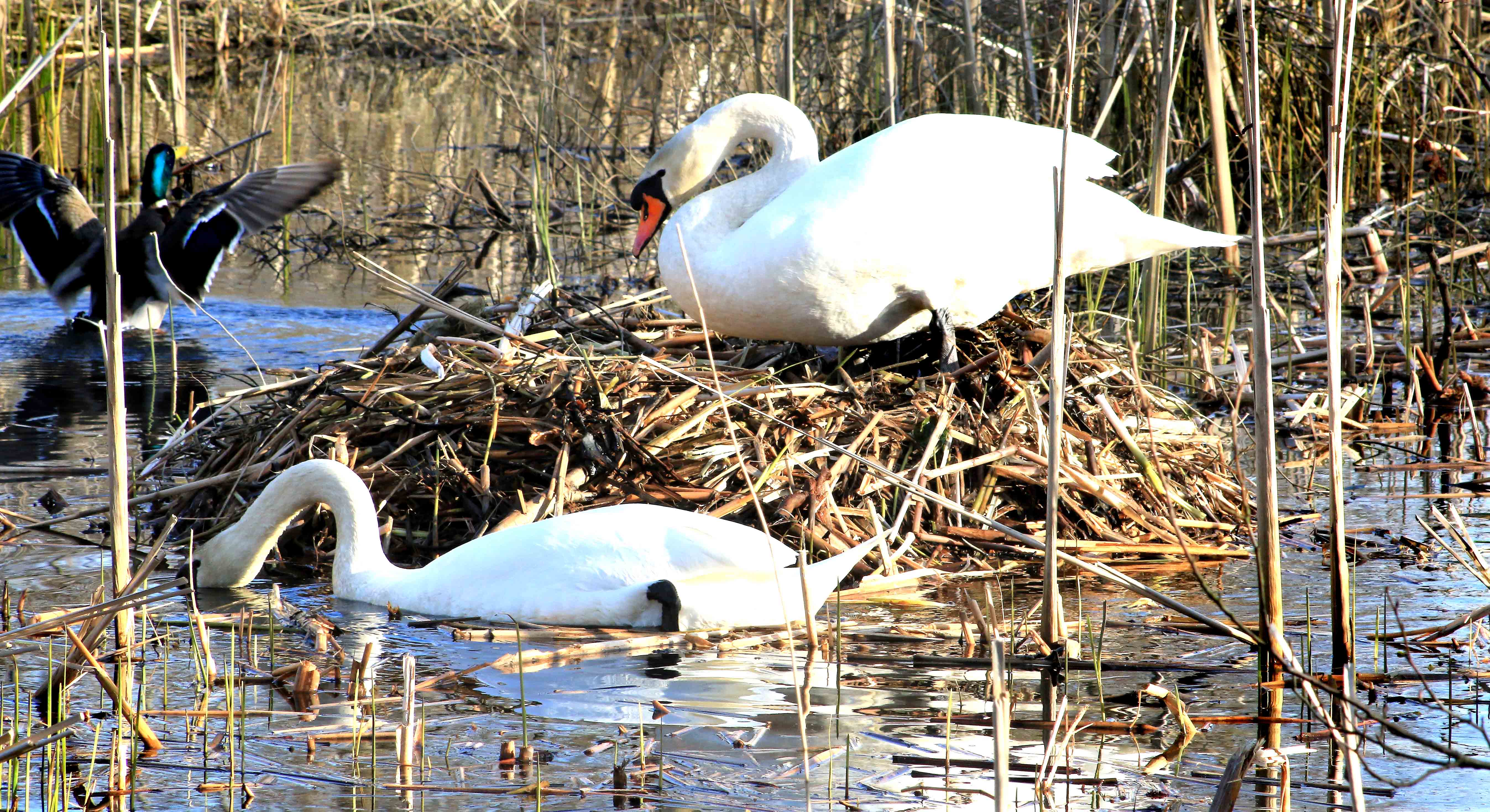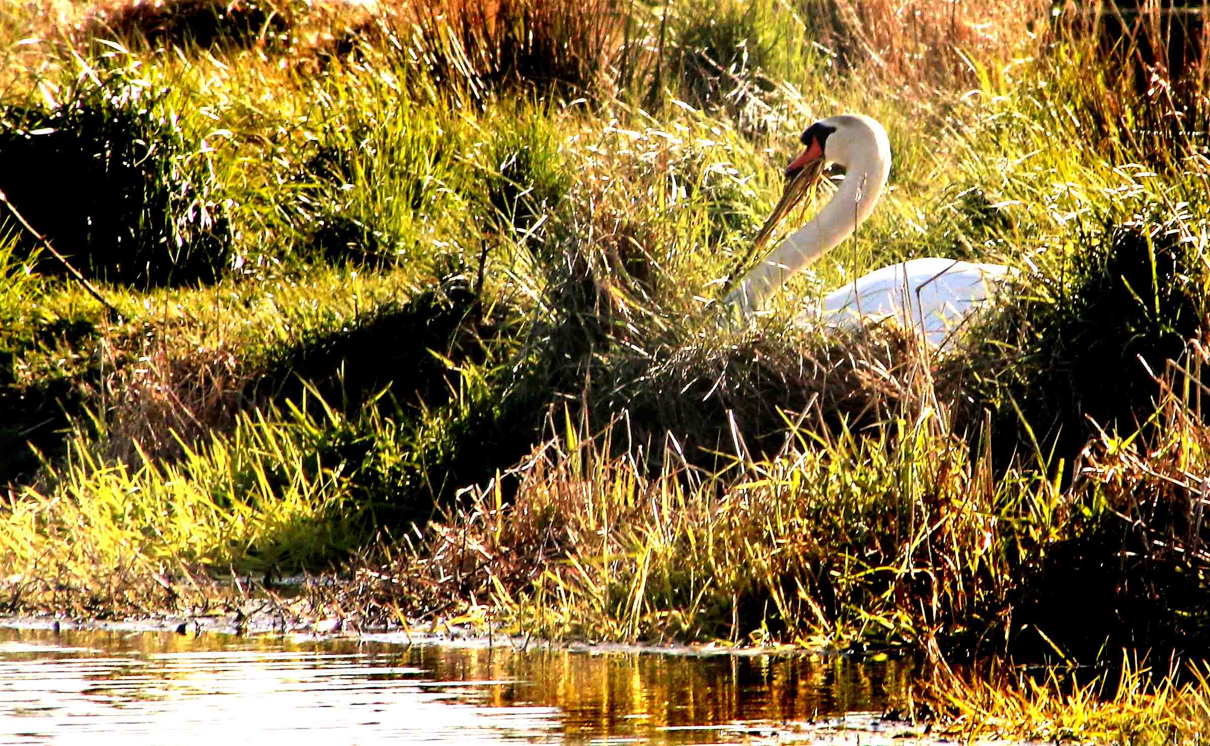 Mellem Jedsted Dambrugs laguner bygger svaneparret reden af vandplanter. Her har de valgt en placering helt i fred.