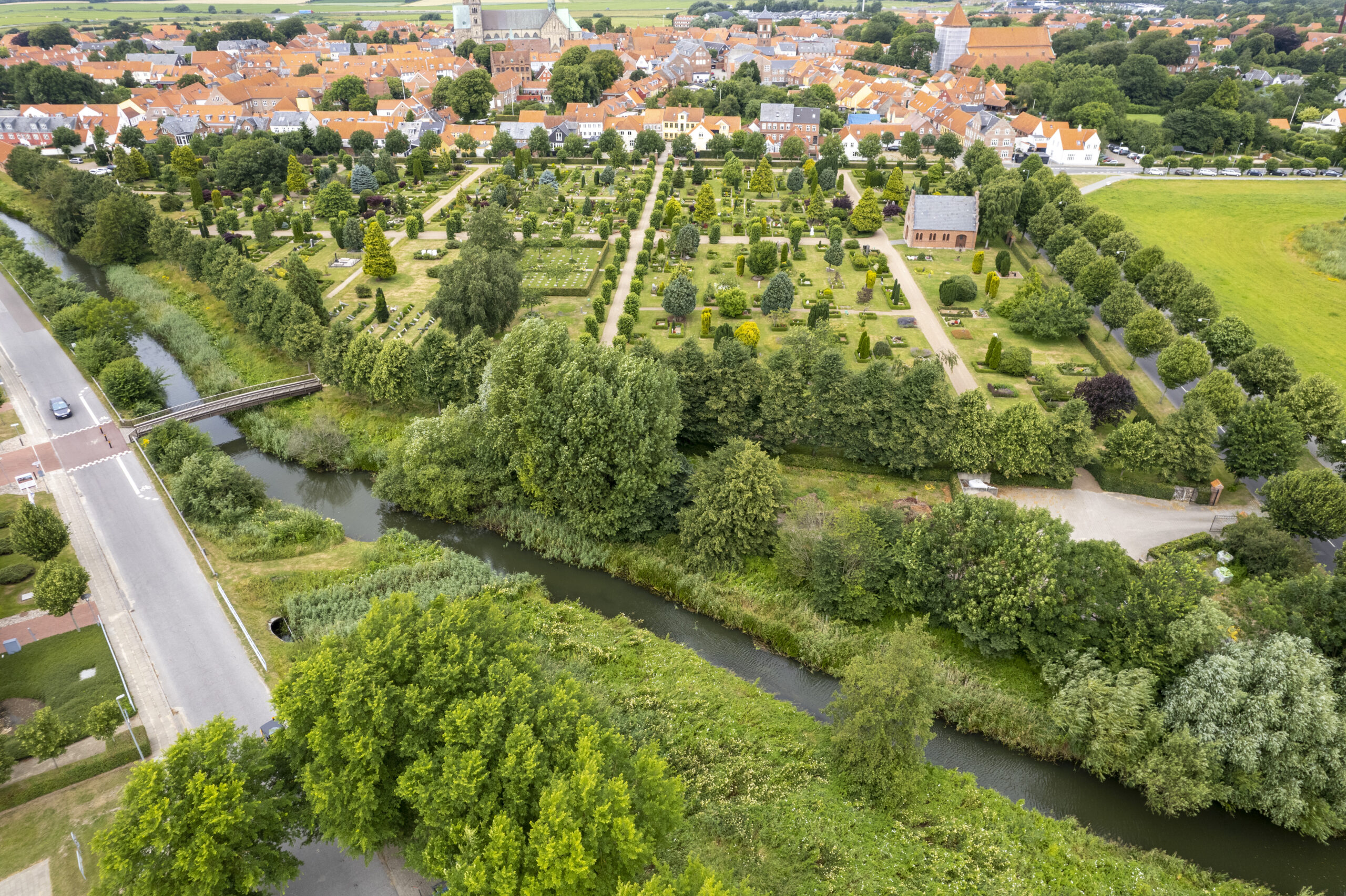 Den Gamle Kirkegård (dronefoto: Ove Detlevsen). Bistaderne anes oven for den nye bro over Stampemølleåen.