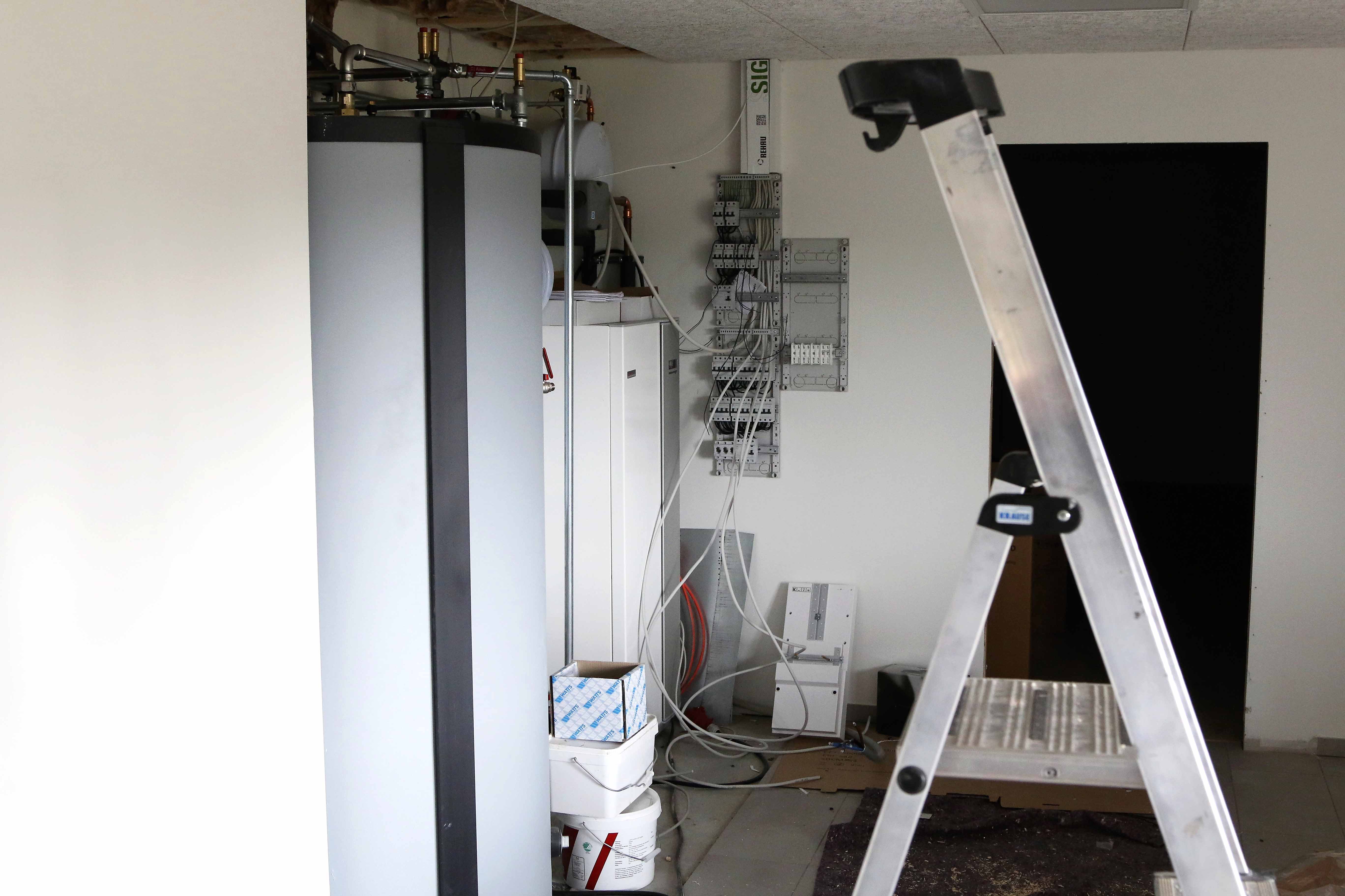 Rundturen kom også forbi teknikrummet, hvor el tavlerne og varmeanlæg er placeret.Der anvendes autoriserede firmaer til disse opgaver – og der kan endnu anes, hvor der er gravet 640 meter slange ned til jordvarmeanlægget. Den årlige udgift til drift vil være ca. 8400 kr.