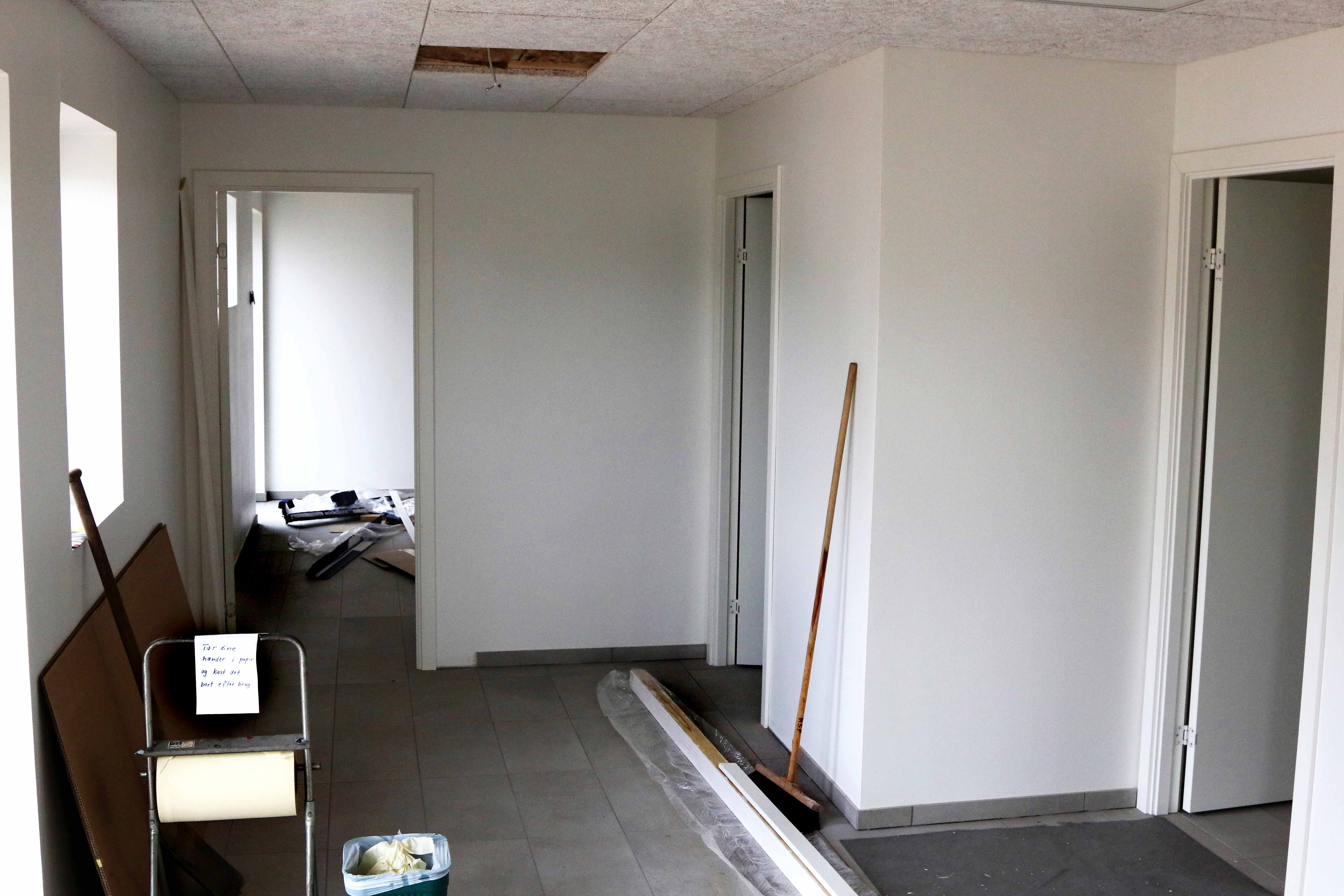 Vi brugte først nogle minutter i det store møderum, hvor der bliver plads til maksimum 50 personer ad gangen. Lokalet har fået nogle småridser her-og-der under montagearbejder. Derfor skal rummet til allersidst have en ny omgang hvid overfladebehandling.