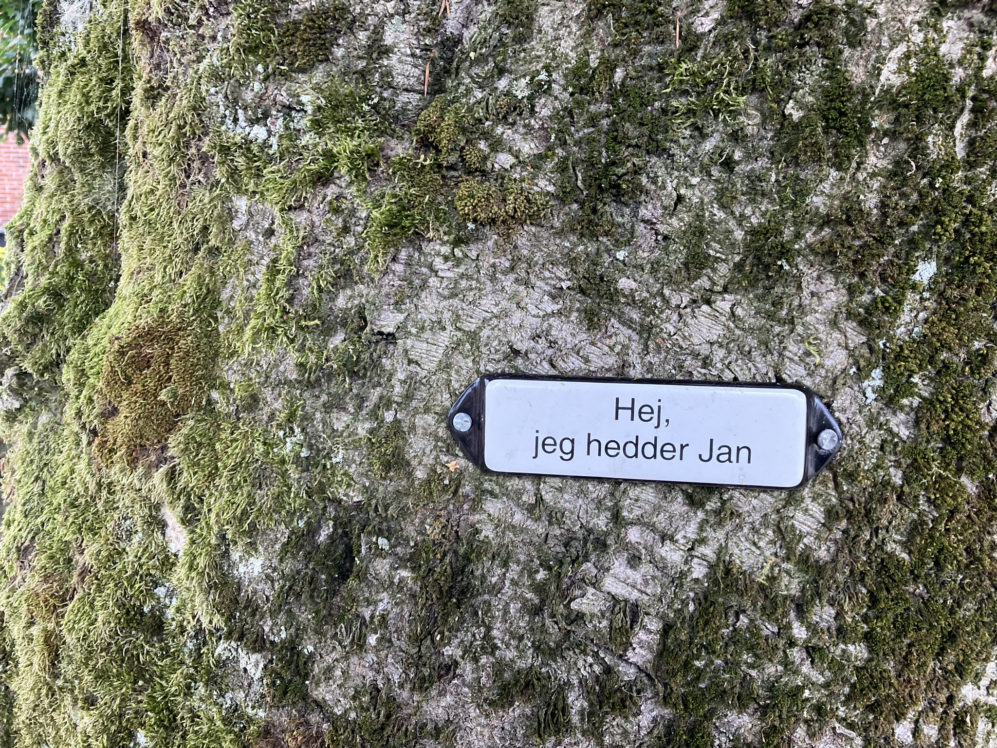 Blikket faldt på et skilt der var skruet på træet. På skiltet står der ”Hej jeg hedder Jan” Er det en ”Jan” der prøver på at få et navne træ? – eller er det en spøgefugl der går og smågriner af dem der betragter skiltet. Nu er jeg blevet nysgerrig på hvad det handler om.