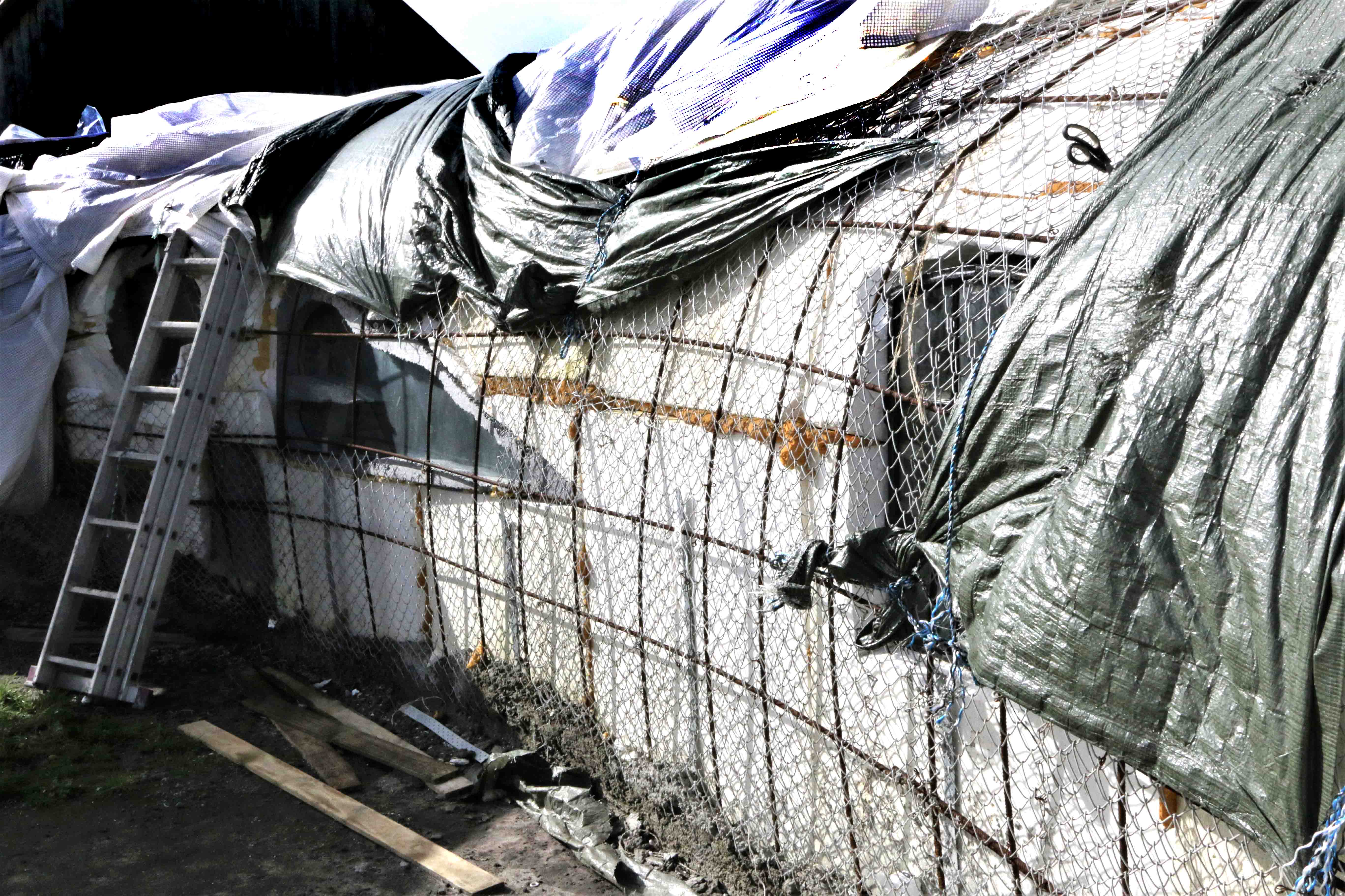”Det har været en sej vinter”, fortæller Jeppe Rosenstand Køser, der havde forberedt sig på frost, men fik både vand og blæst som modspiller. ”Men jeg er stadig optimist – og efter dagens støbning af gulvet ”uden mundvand”, så gælder det om at få højde på hovedet, så det samtidig kan blive helt vandtæt”, siger Jeppe til RYK IND RIBE, der herefter gør klar til at pakke hele hvalen ind i rionet og tråd – og så skal der ”endelig” støbes indenfor.