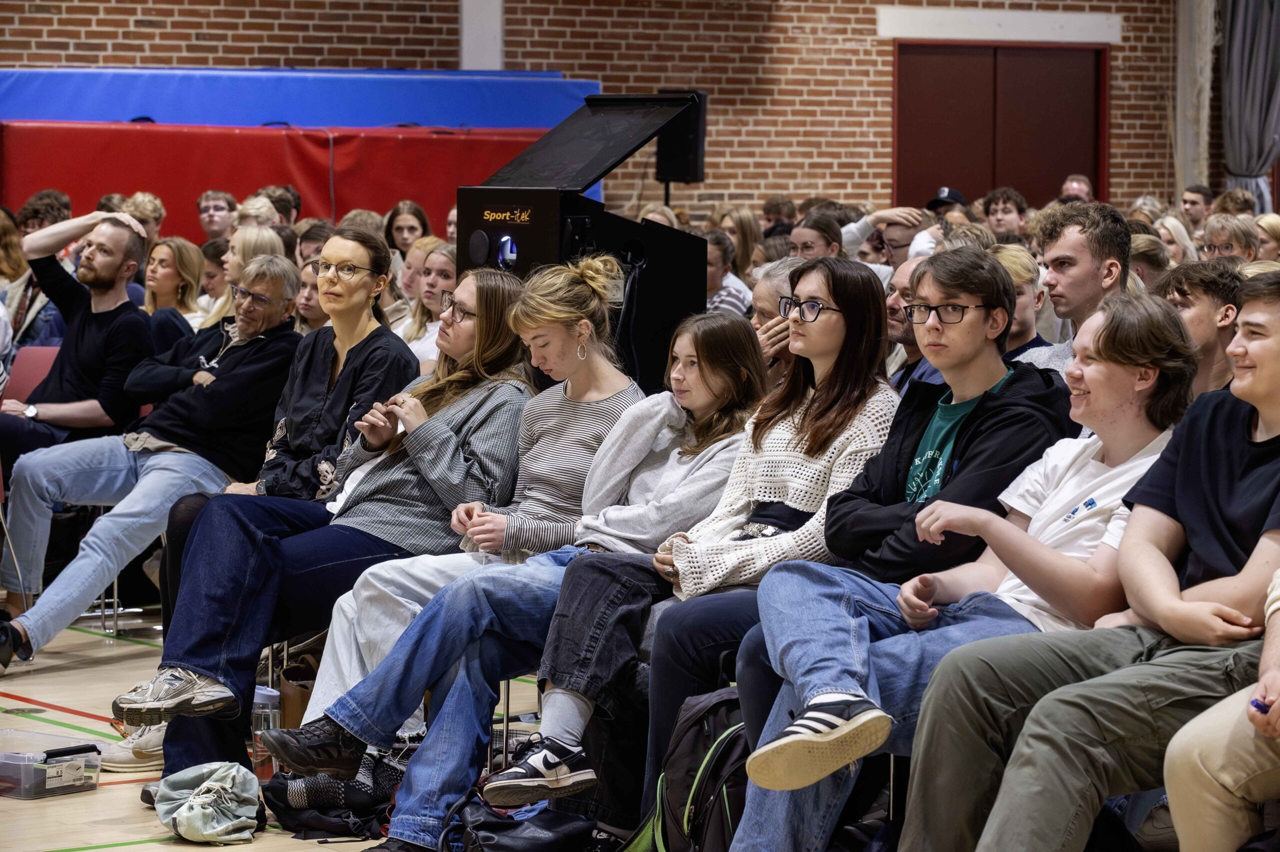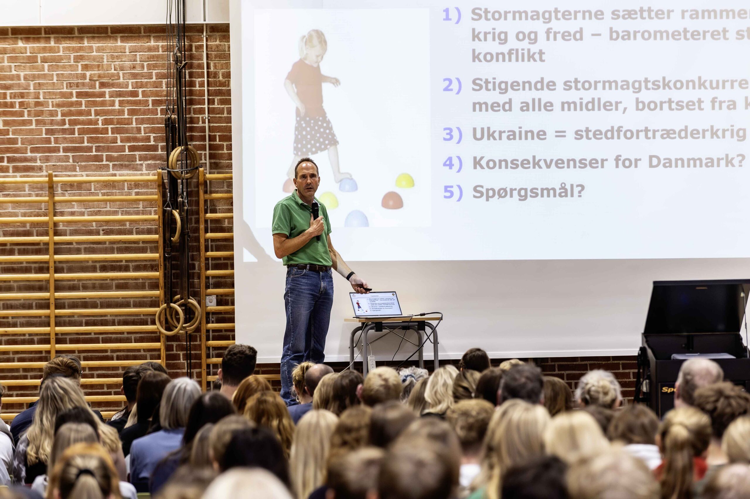 På underholdende og skarpsindig vis gav Peter Viggo Jakobsen eleverne et overblik over verdens komplekse tilstand anno 2025. Med skarpe perspektiver og nye måder at forstå udviklingen på, satte han dagens konflikter og udfordringer i proportioner – så vi bedre kan navigere i en urolig tid, hvor spørgsmålene ofte er flere end svarene.