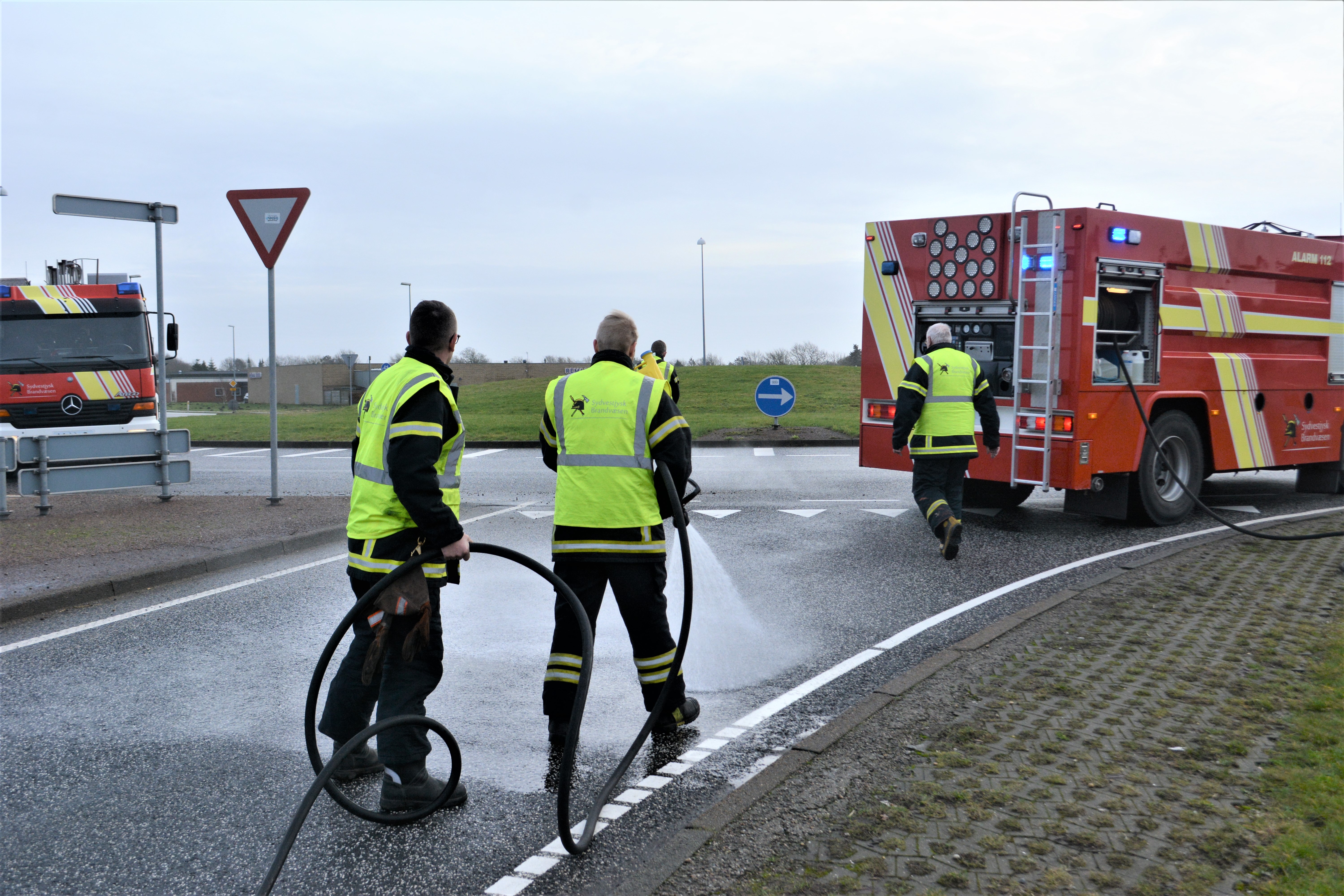 I første omgang sørgede personale fra firmaet selv at sprede noget grus ud over den spildte olie, hvorefter brandvæsnet rensede vejbanen i rundkørslen, hvor de største mængder olie lå.