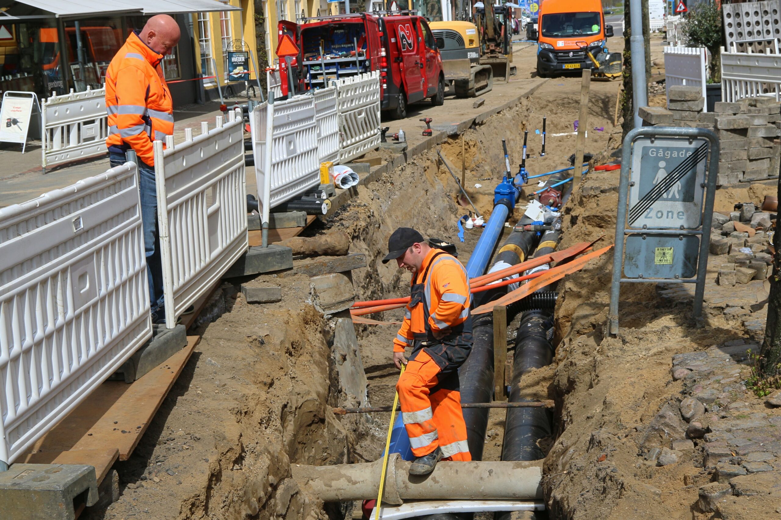 I Saltgade er DIN Forsyning og Ribe Fjernvarme i gang med at udskifte rør. Tirsdag eftermiddag var humøret højt – og Ribe Fjernvarmes folk kunne gøre status: – Vi slipper for at arbejde i nat!. Også DIN Forsyning var tilfreds med de opgaver, som de skal have på plads med ny vandledning.