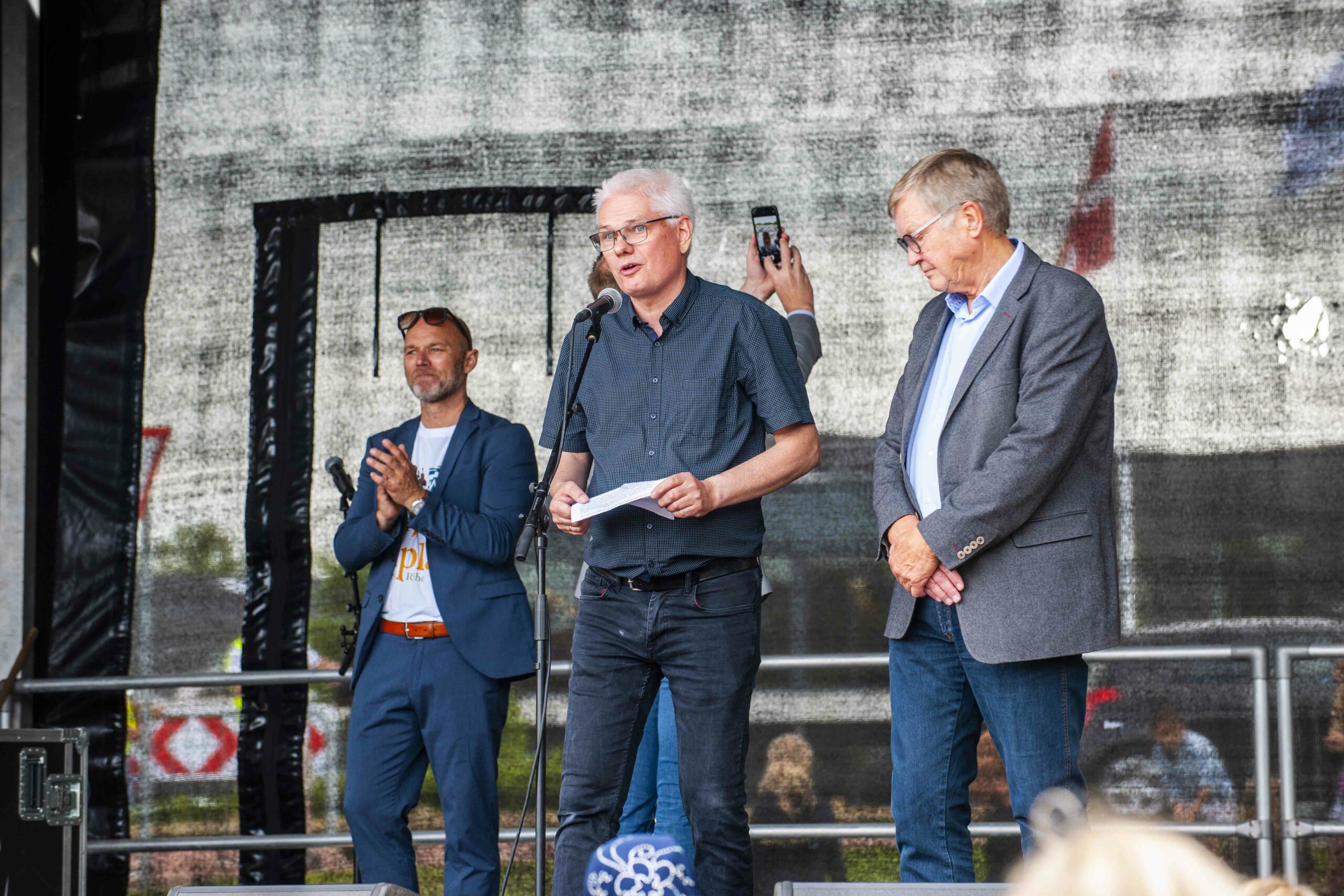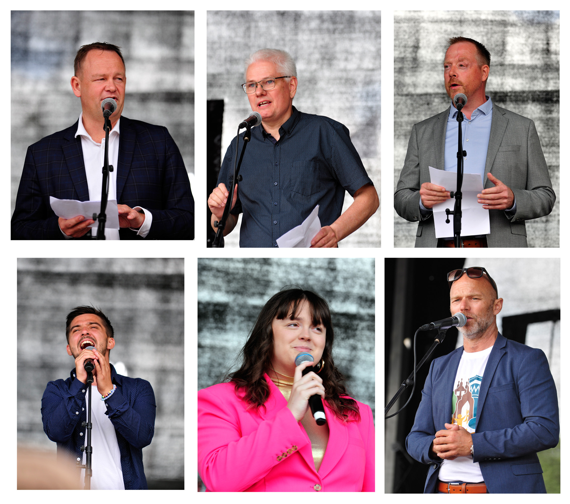Dagens talere ved den officielle del af åbningsfesten. Øverst fra venstre borgmester Jesper Frost Rasmussen, Carsten Lund og Peter Laursen. Neders fra venstre Kári, Tina og Claus Pedersen, der var dagens konferencier.