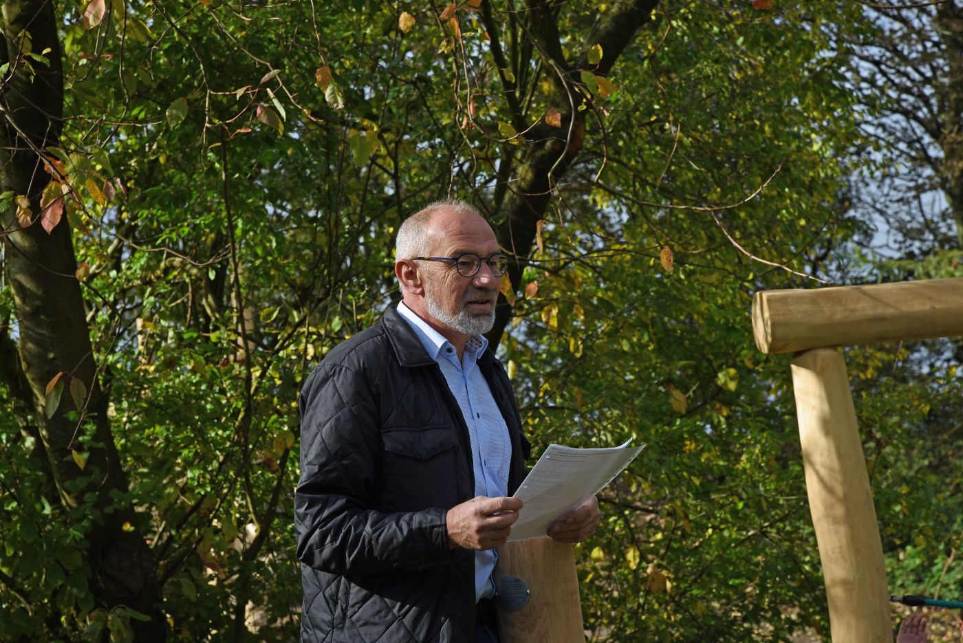 Solen skinnede, og det var lunt, da formanden for fællesudvalget for Jernved og Jernvedlunds Borgerforening, Kurt Bjerrum, trådte op på et legeredskab for at holde indvielsestalen over opgraderingen af legepladsen, der blev indviet i 2012.