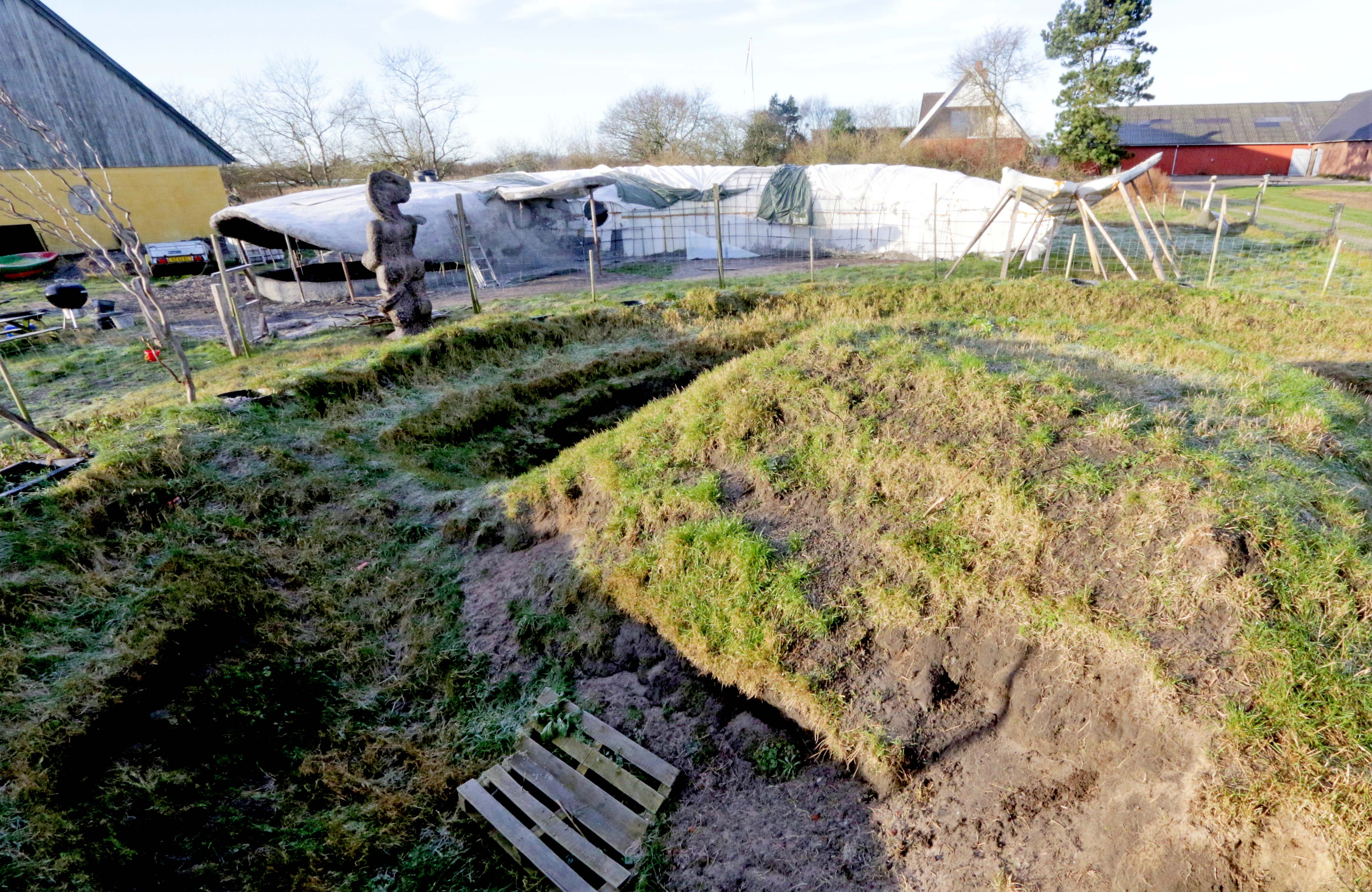 Jeppe Rosenstand Køser startede sin installation med håndkraft – kort og godt en spade og en trillebøre, men måtte hurtigt indse, at det ikke ligefrem flyttede tilstrækkeligt med jord. Derfor hjalp en god ven med at grave og forme jorden, så den kom til at fremstå med både mulighed for at finde læ, stå på toppen og betragte omgivelser samt ikke mindst at bevæge sig helt ned til grundvandet.