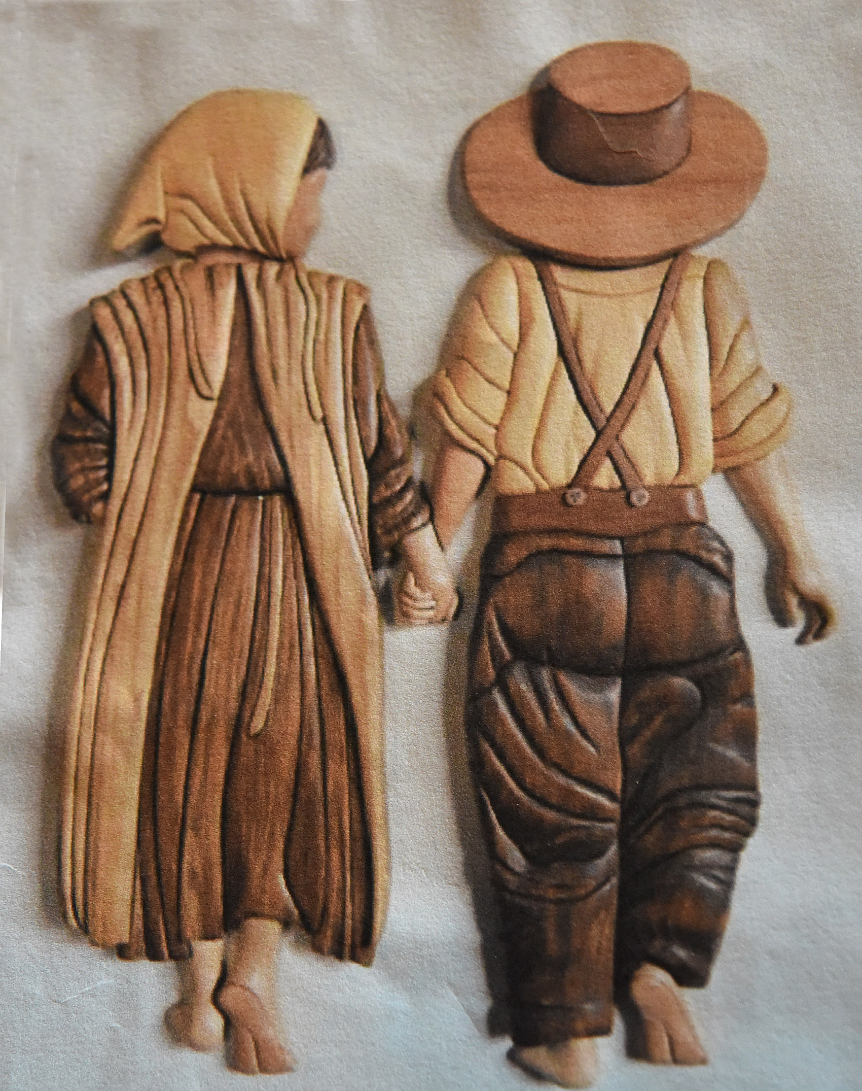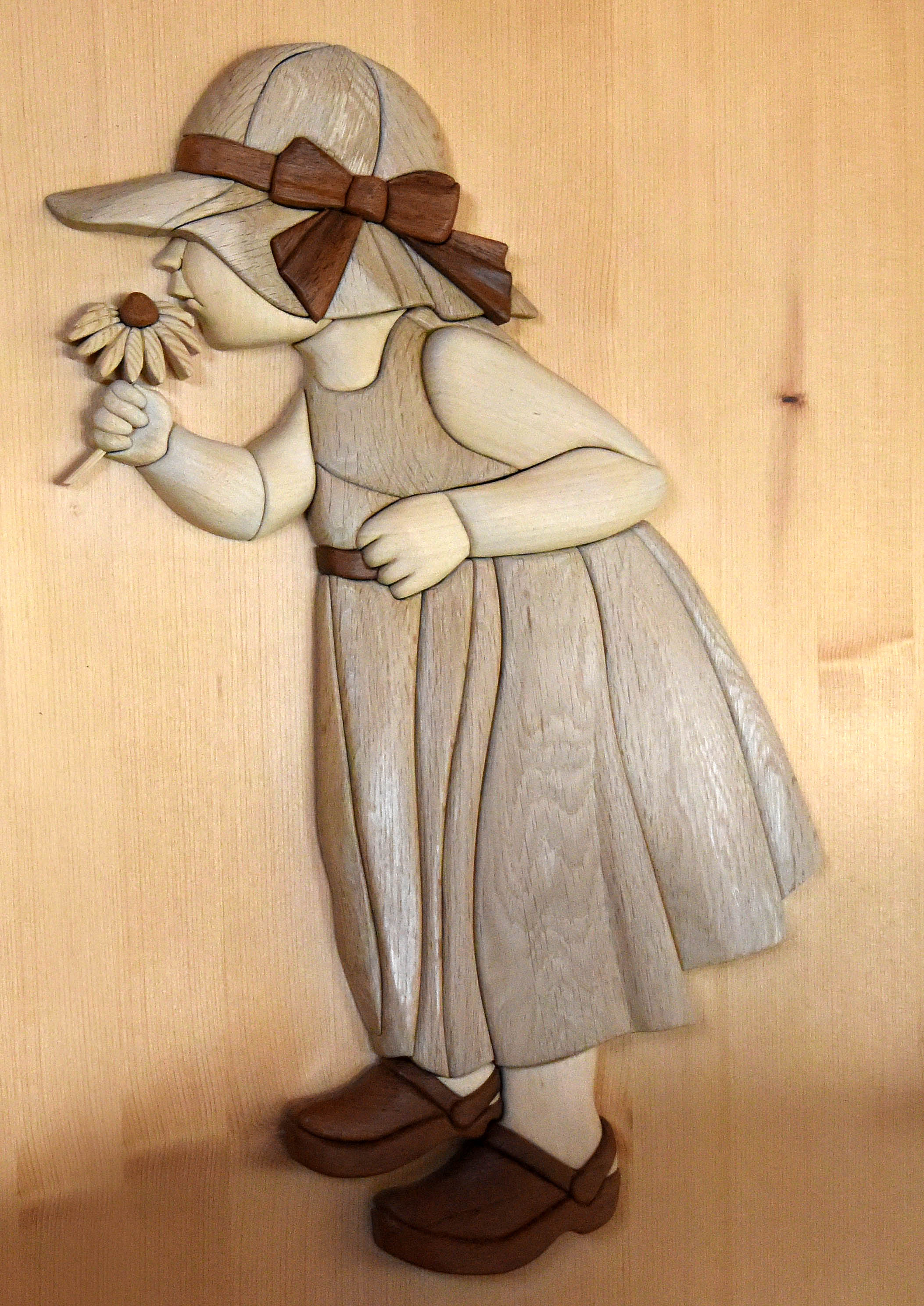 ”The smelling flower” er den første collage, som George Rasmussen lavede til sin kone i 2011: et træsnitningsarbejde / Intarsia med 3 dimensional effekt, hvor træet skaber figuren i sine naturlige farver. Den flotte collage er privateje. Den har været udstillet forrige år på julemarkedet på det gl. rådhus i Ribe. Georg fortæller, at en collage kan tage flere måneder at lave – det afhænger af detaljerne.