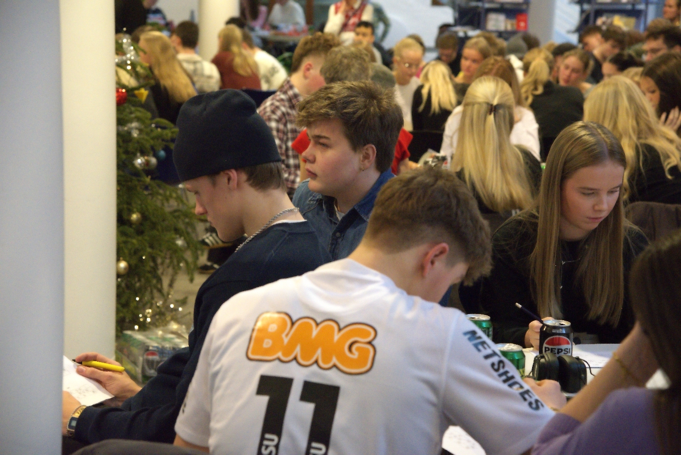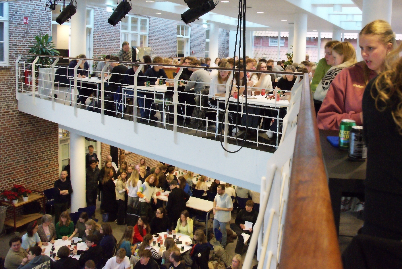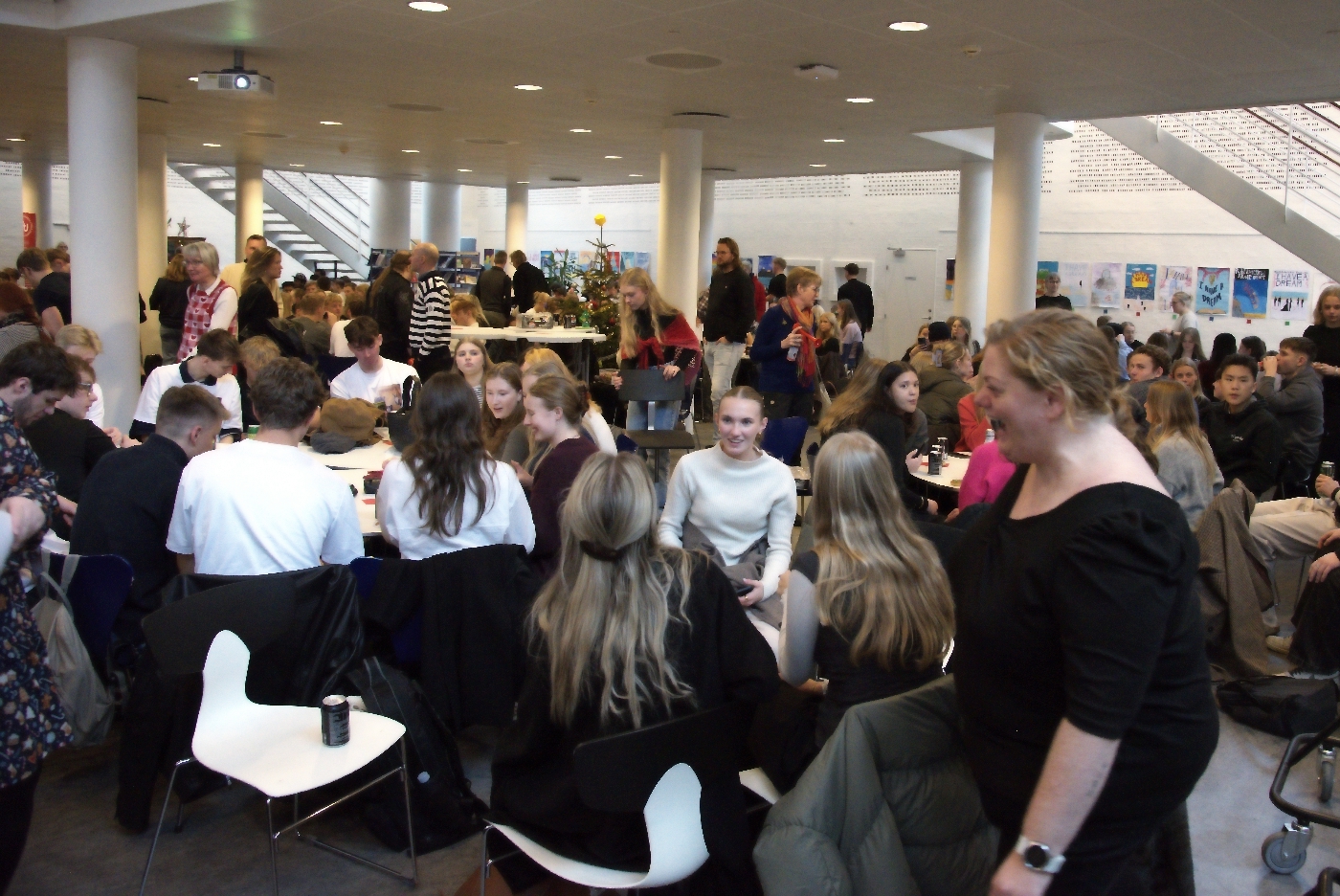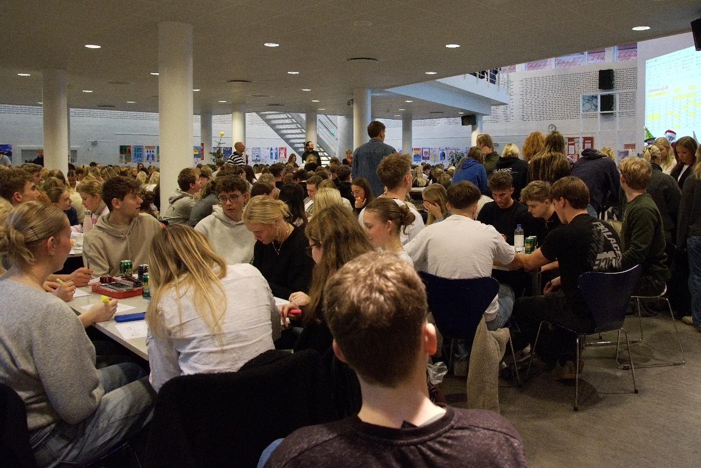 Fredag formiddag satte omkring 700 elever og 70 lærere et humørfyldt punktum for december måned og det første halvår af 2025 på Ribe Katedralskole, da skolen afholdt sin traditionsrige juleafslutning i den imponerende fællessal i to etager. Salen var fyldt, humøret var højt, og julestemningen bredte sig blandt både elever og lærere.