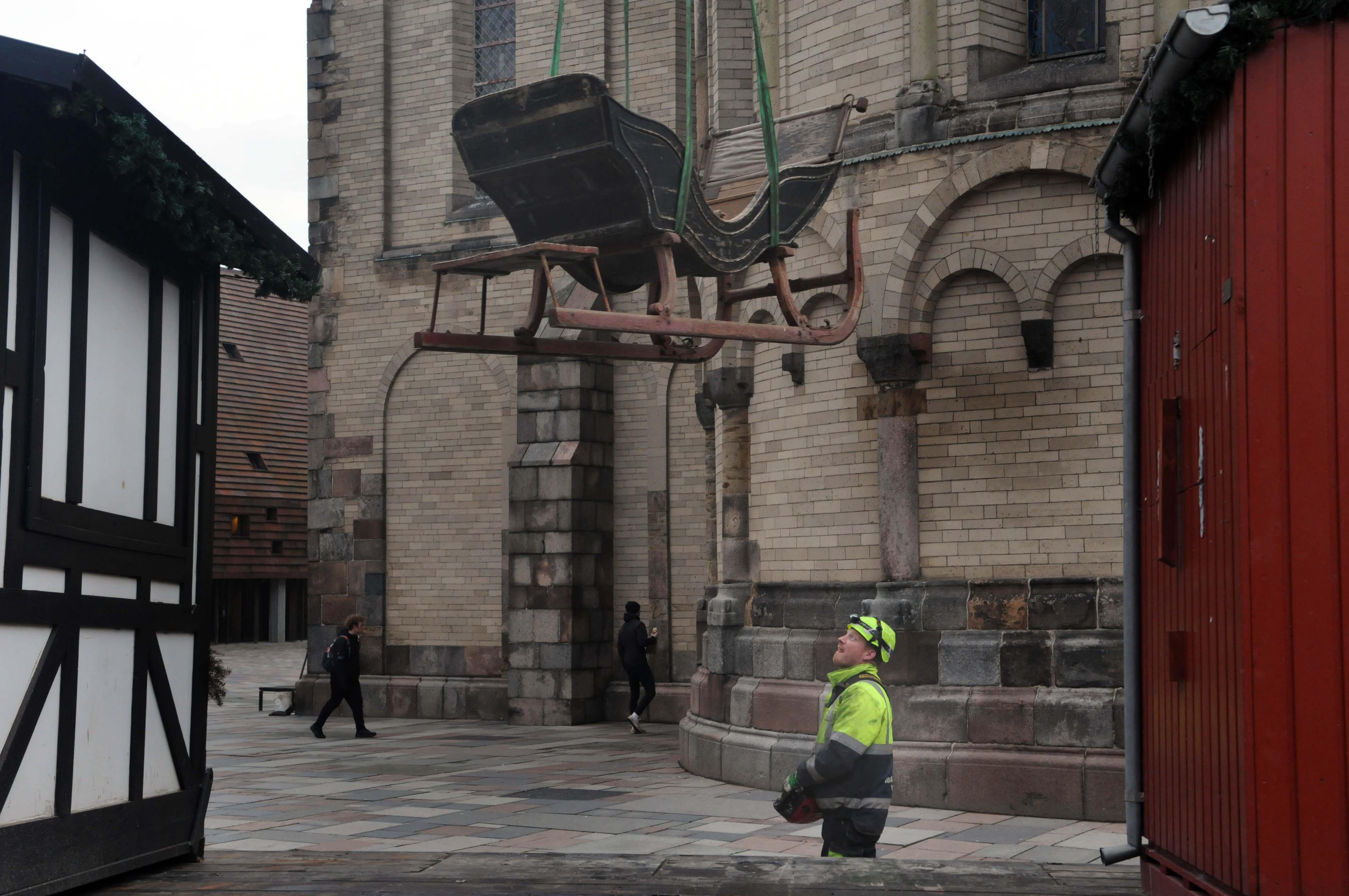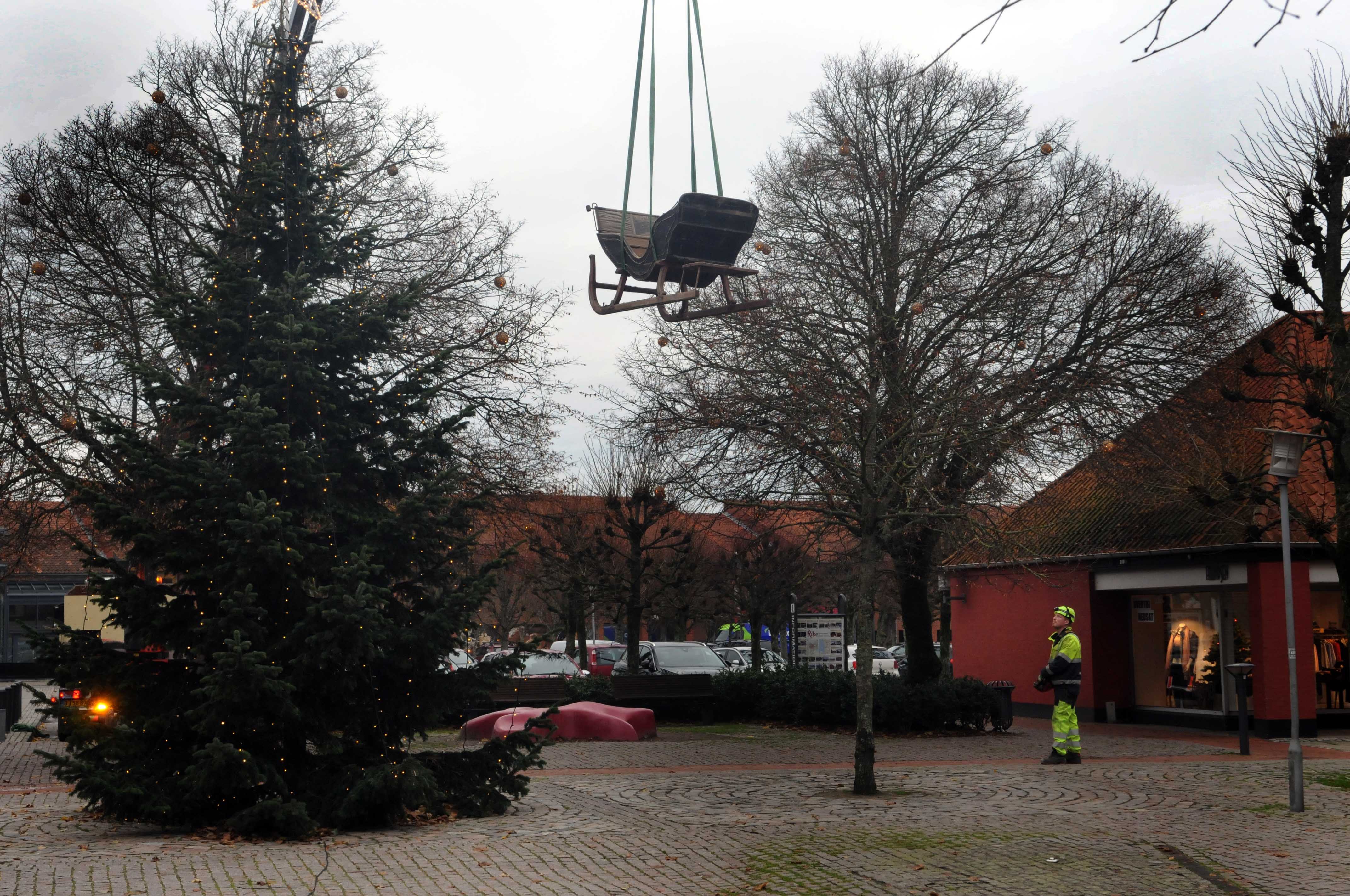 Ingen jul uden en kane og det er der da også tradition for i Ribe. En hurtig omlæsning mellem bilerne og Jakob Leth kunne fragte kanen videre til J. Lauritzens Plads, hvor den pyntes op og gør torvet hyggelig.
