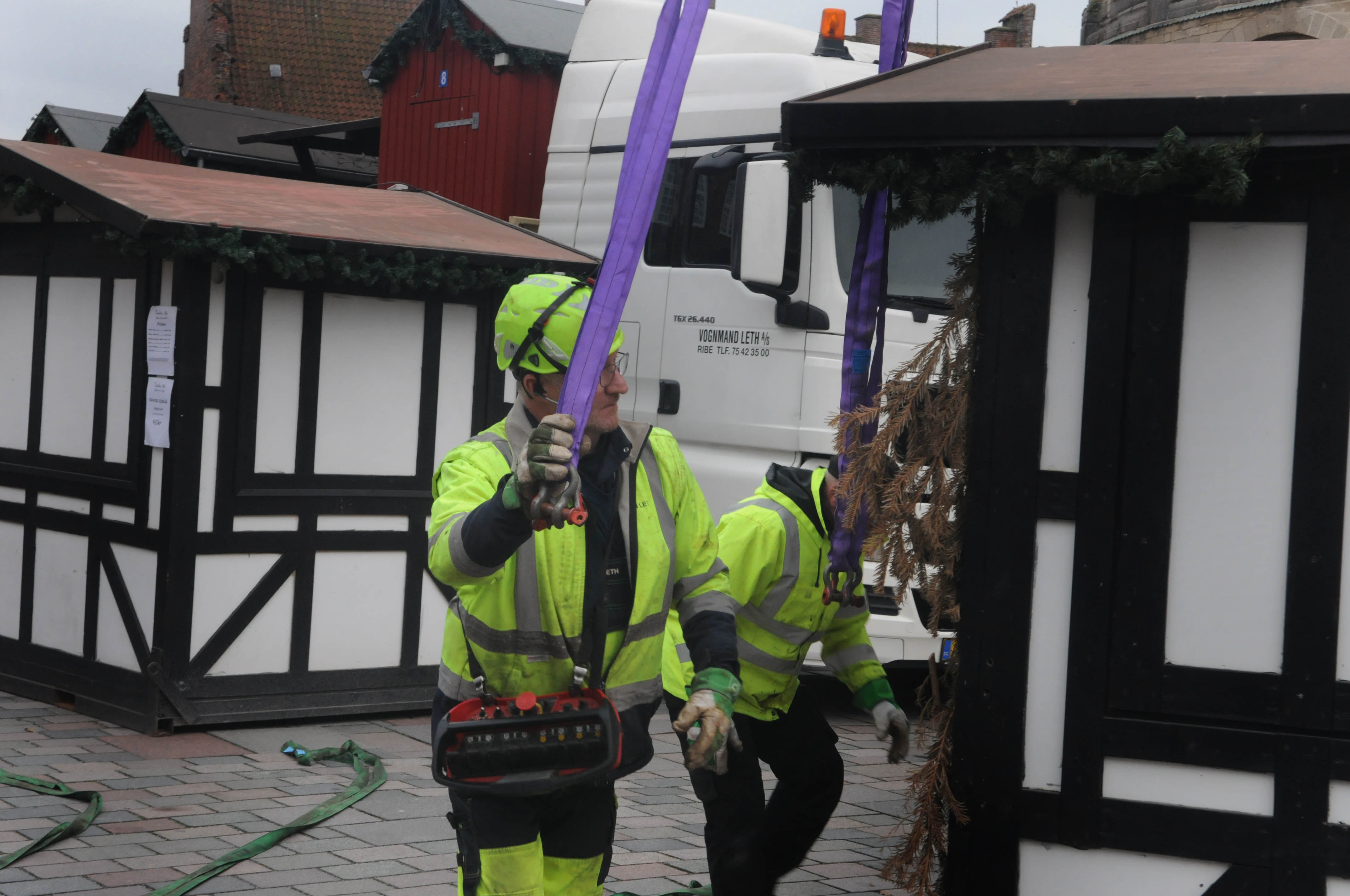 Med stor præcision fik Preben Leth, sønnen Jakob og Søren Adelhardt julehytterne på plads. (foto Renè Jørgensen)