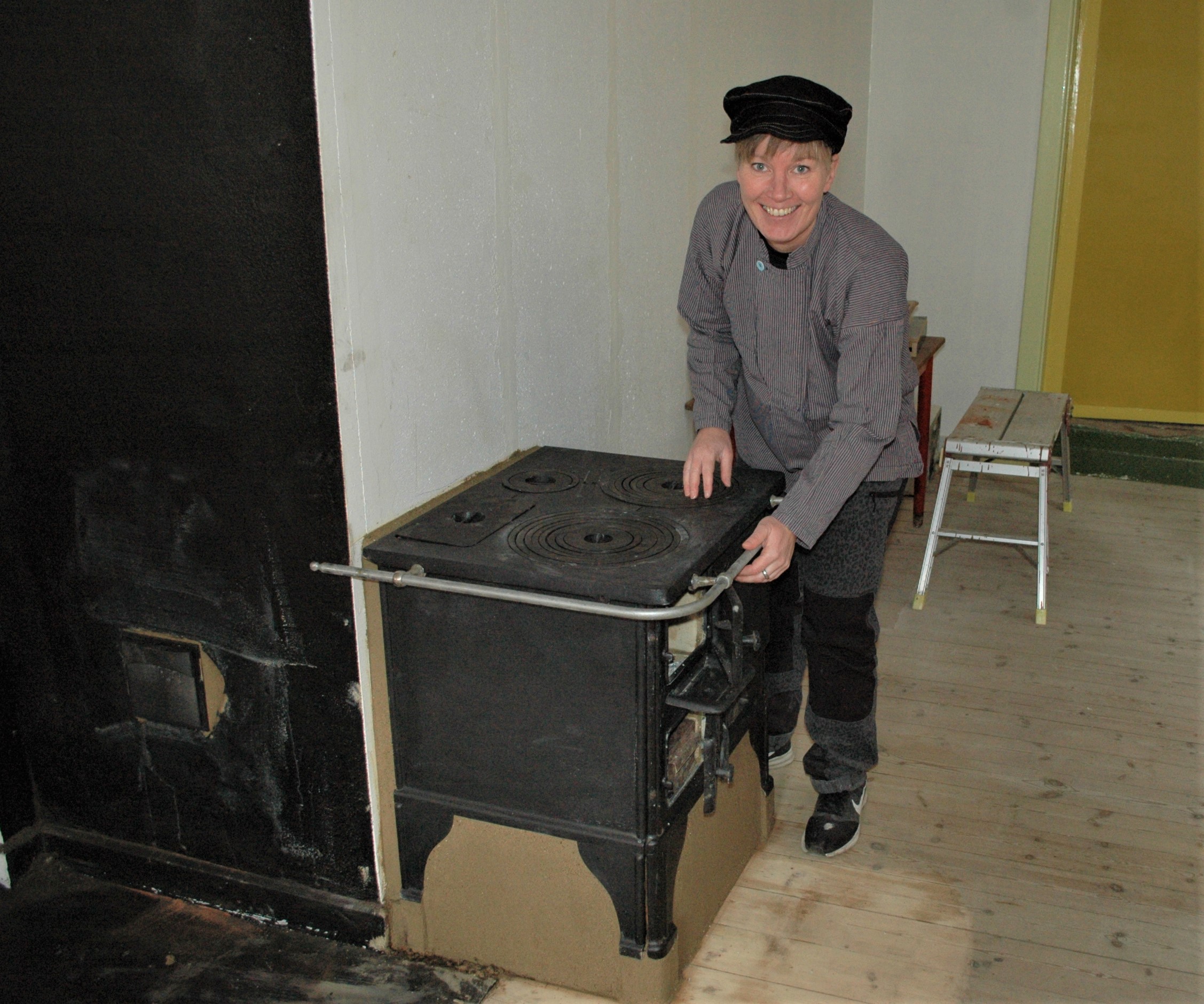 Dels har bygningen tidligere rummet et snedkerværksted med tilhørende familie, og dels har man netop fundet et rigtigt gammelt komfur på Den Blå Avis, som man har erhvervet til rimelige penge. Og da skorstensfejeren blev spurgt, om dette komfur kunne tilsluttes den eksisterende skorsten, kendte skorstensfejeren en ovnsætter, der kunne installere komfuret.