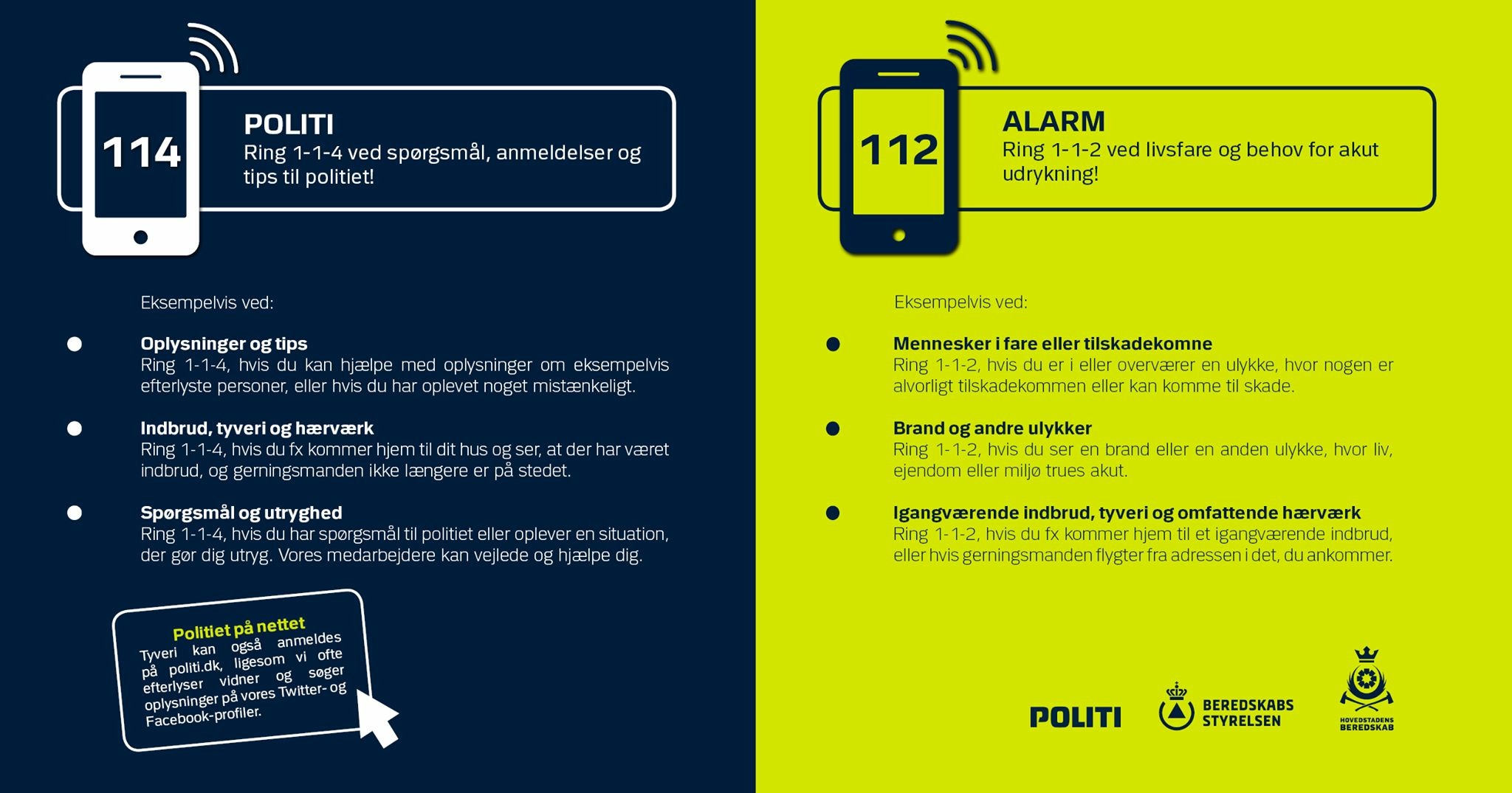 Derfor vil Politiet gerne genopfriske, hvornår man skal ringe 1-1-2 eller 1-1-4. I grafikken er der forsøgt at adskille de to numre og give de generelle retningslinjer for, hvornår man skal taste det ene nummer frem for det andet.