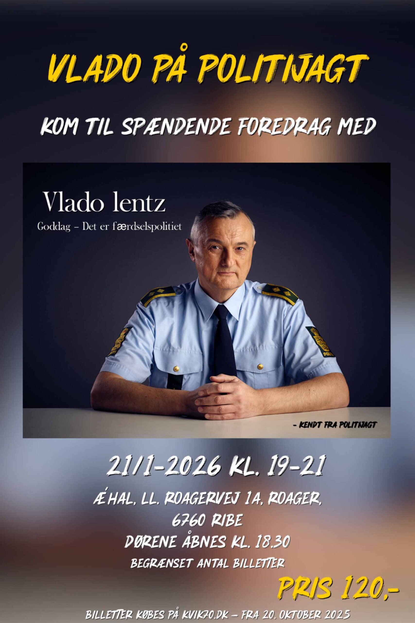 Den 21. januar 2026 får Ribe besøg af en af landets mest markante profiler inden for færdselsarbejdet, når Vlado Lentz, kendt fra tv-programmet Politijagt, indtager scenen i hallen i Roager. Her vil han give et unikt indblik i en hverdag fyldt med trafikopgaver, akutte hændelser og møder med danskere i alle livets situationer.
