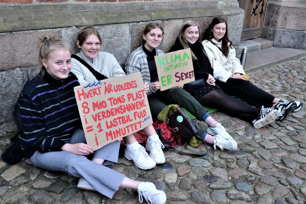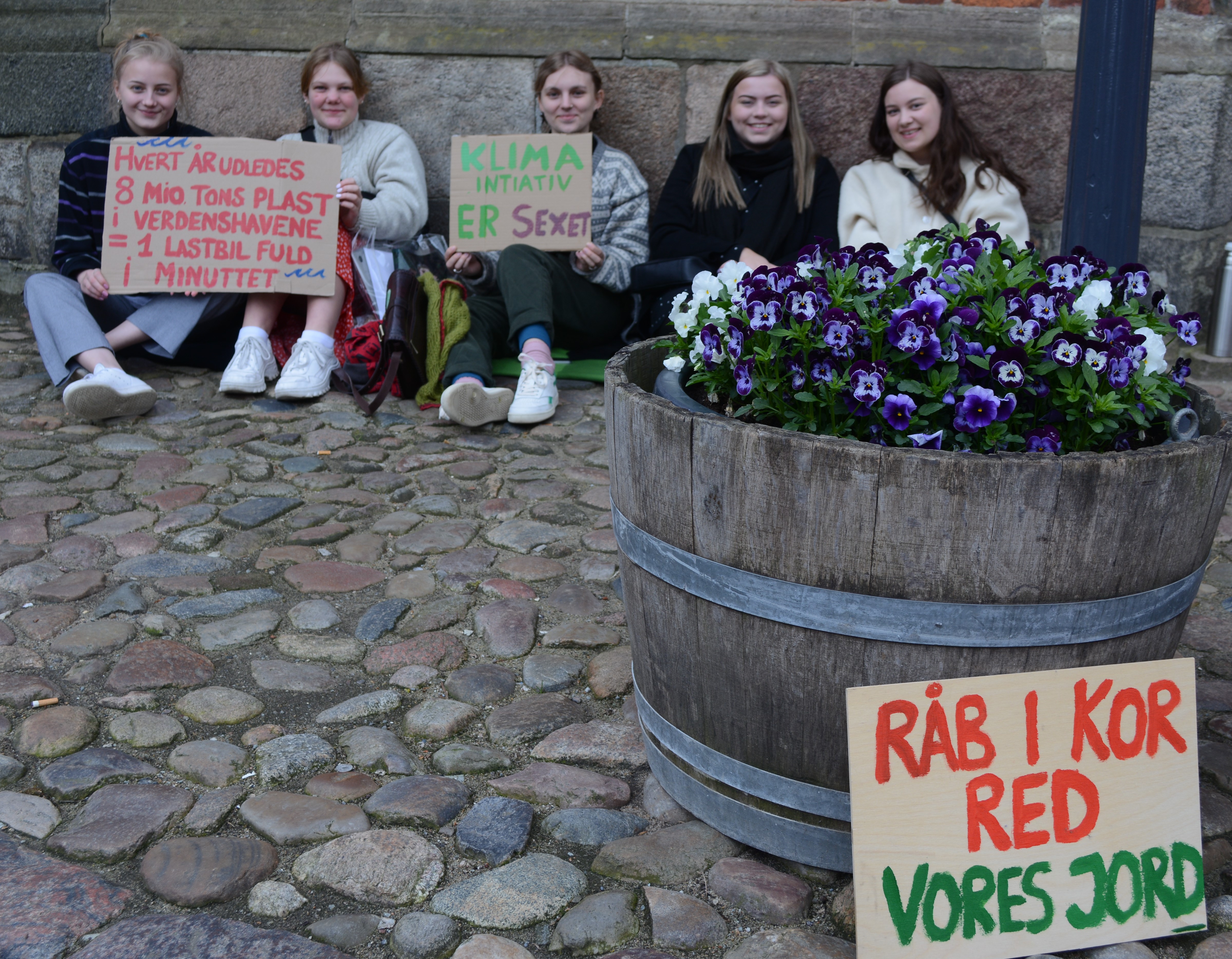 De fem piger demonstrerede siddende på de kolde fliser foran Det Gamle Rådhus i Ribe, og budskabet var tydeligt: vi skal alle gøre noget for at forbedre vores klima.